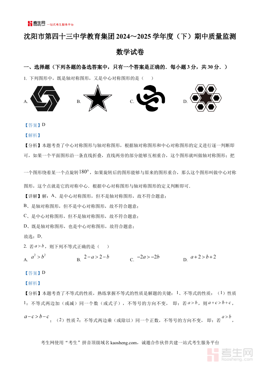 《精品解析:辽宁省沈阳市第四十三中学2024-2025学年 八年级下学期4月数学期中试卷 (解析版)》是针对2024-2025学年辽宁省沈阳市第四十三中学八年级下学期4月数学期中考试的专业备考资料,它依托该次期中考试的试卷内容展开深度解析,能够帮助使用者精准把握考试的命题方向与考查重点,为后续的复习与备考工作提供清晰且专业的依据,助力使用者更有针对性地开展学习或教学活动,确保备考过程与考试要求紧密衔接。