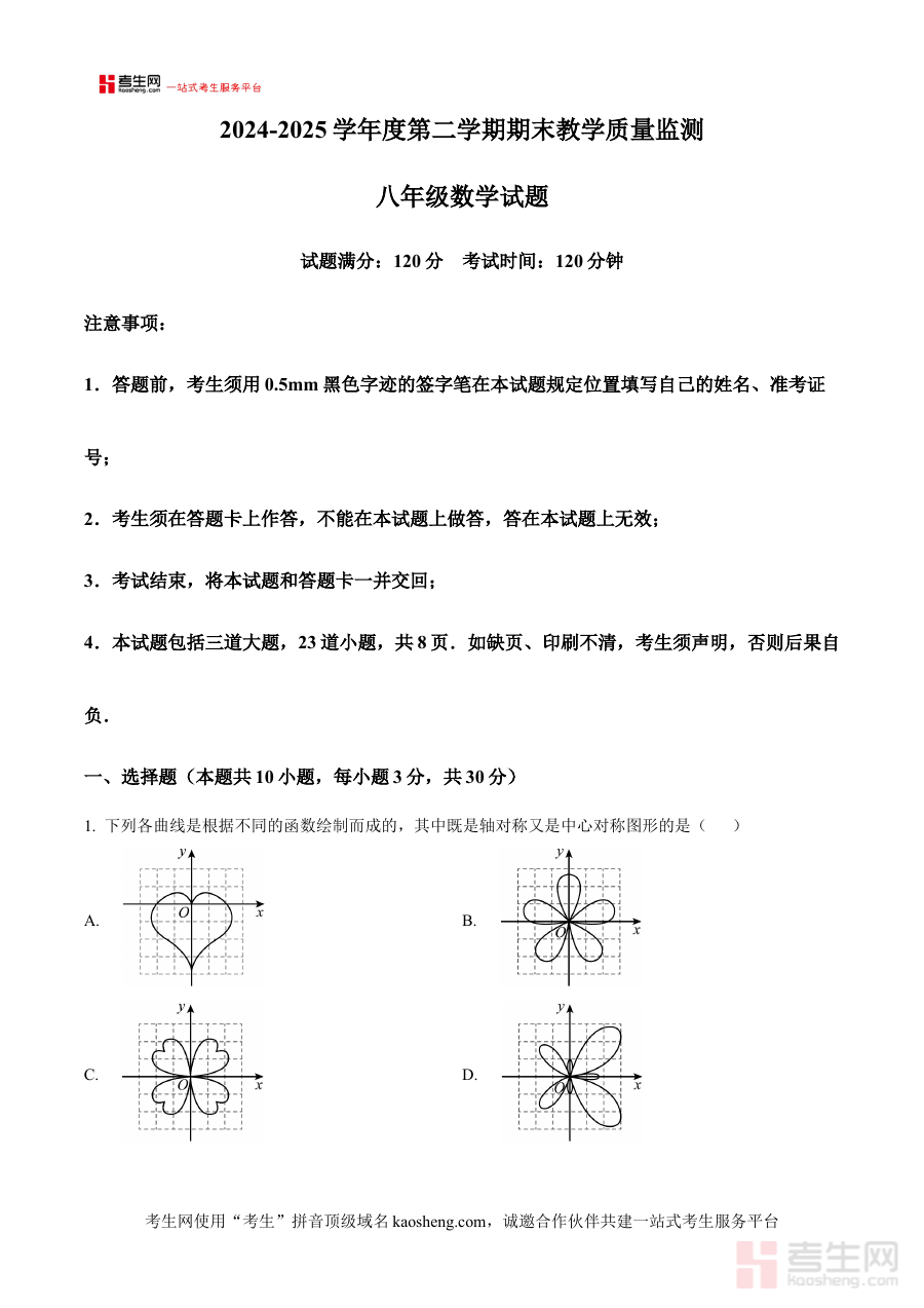 该资料可用于八年级学生进行期末考前的自我检测,帮助教师了解学生对学期知识的掌握情况以优化教学安排,也能为家长提供辅助孩子备考的参考依据,通过原卷形式还原考试场景,助力使用者明确备考方向与重点。