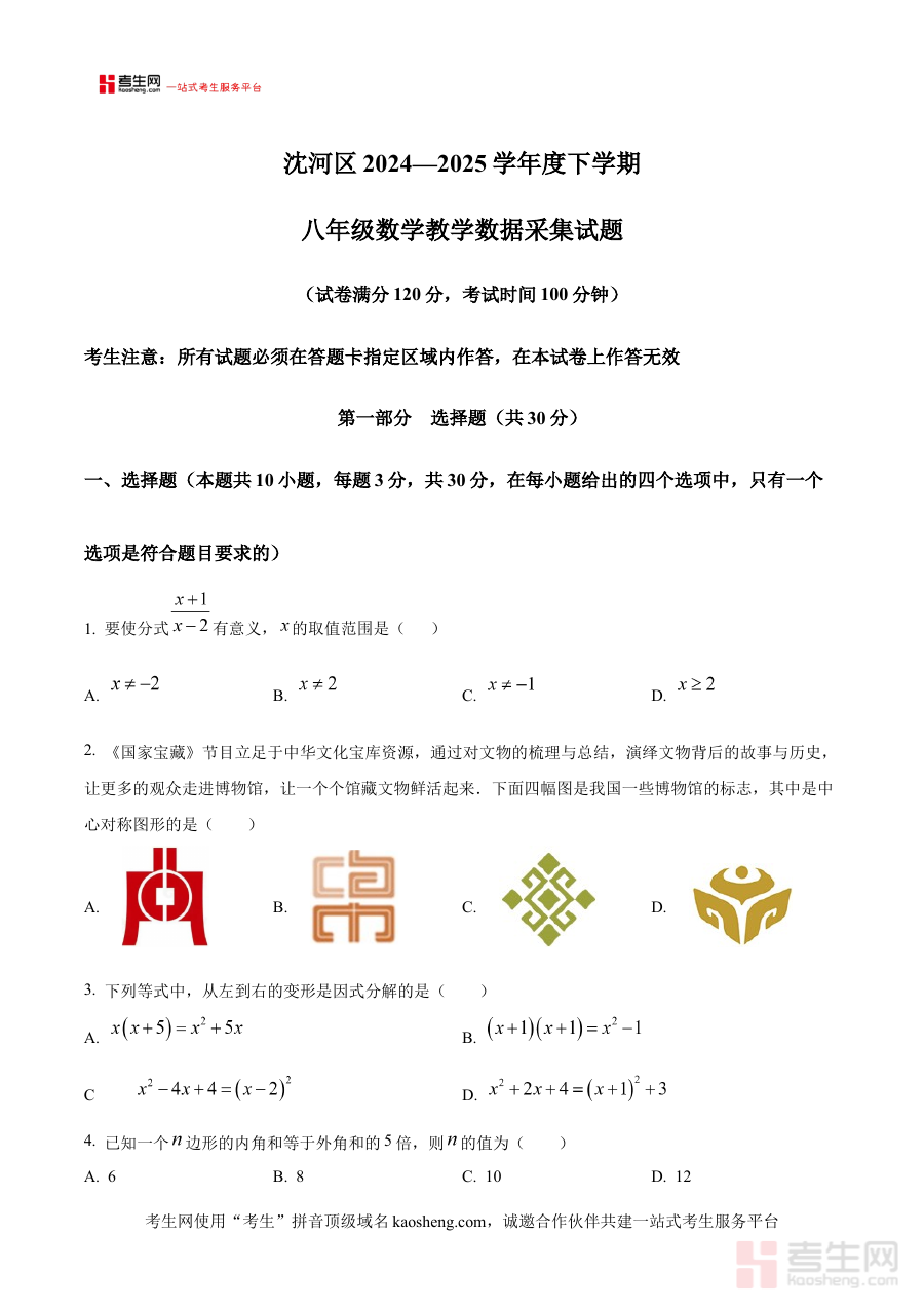《精品解析:辽宁省沈阳市沈河区2024-2025学年 下学期八年级数学 期末试卷(原卷版)》是针对辽宁省沈阳市沈河区2024-2025学年下学期八年级数学期末检测的备考资料,精准对应该区域该学年段数学学科的期末考核需求,为使用者提供贴合本地教学进度与考试标准的参考依据。