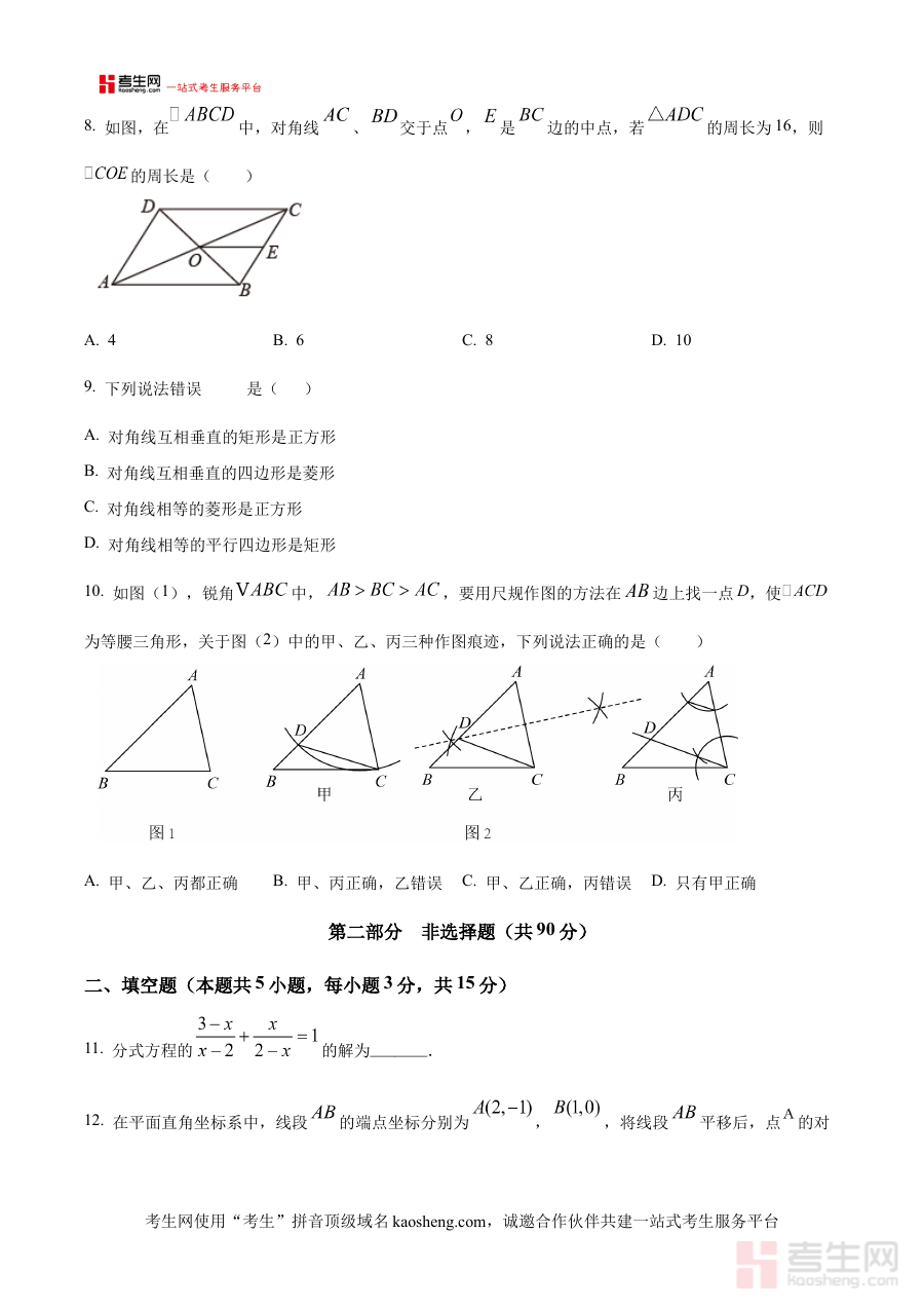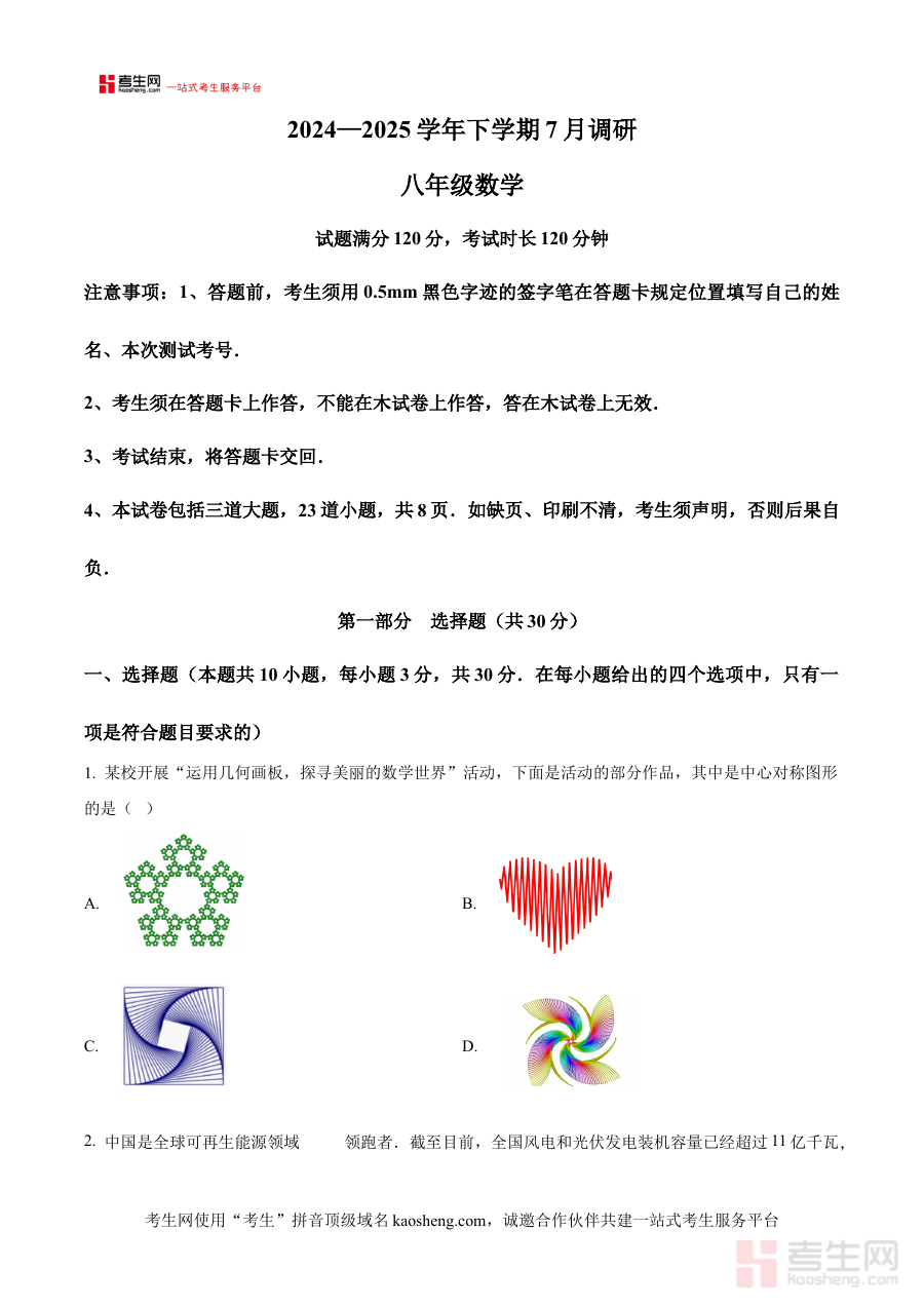 本资料适用于沈阳市浑南区2024—2025学年下学期的八年级学生及相关数学教师,对于学生而言,有助于熟悉期末考的考试形式与节奏,为期末考试做好充分准备;对于教师来说,可用于教学评估或设计复习方案,提升教学与备考的效率和针对性。