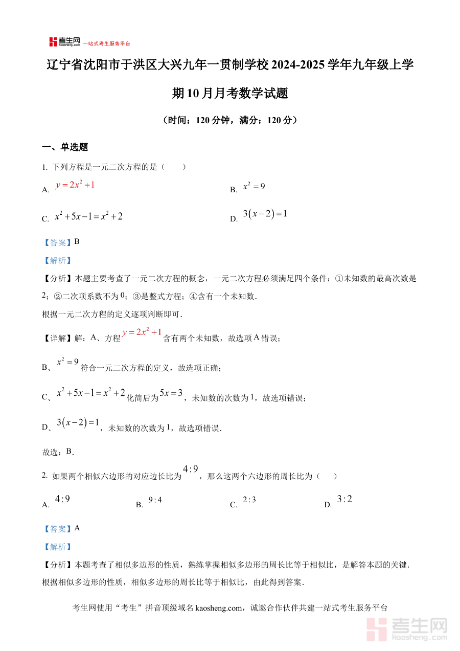 《精品解析:辽宁省沈阳市于洪区大兴九年一贯制学校2024-2025学年九年级上学期10月月考数学试题(解析版)》是针对辽宁省沈阳市于洪区大兴九年一贯制学校2024-2025学年九年级上学期10月数学月考的专业备考资料,聚焦该校该阶段内部阶段性数学检测需求,为使用者提供贴合本校考试实际的解析内容。