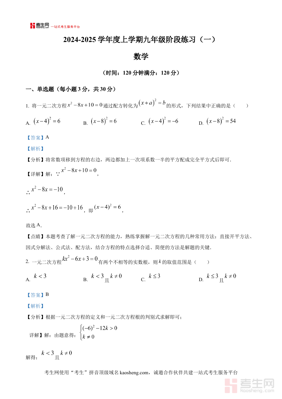 《精品解析:辽宁省沈阳市杏坛中学2024-2025学年度上学期九年级10月份月考数学试卷(解析版)》是针对辽宁省沈阳市杏坛中学2024-2025学年上学期九年级10月月考数学科目的专项备考资料,精准对应该学校该阶段的数学教学进度与考试要求,为使用者提供贴合实际的学习参考依据。