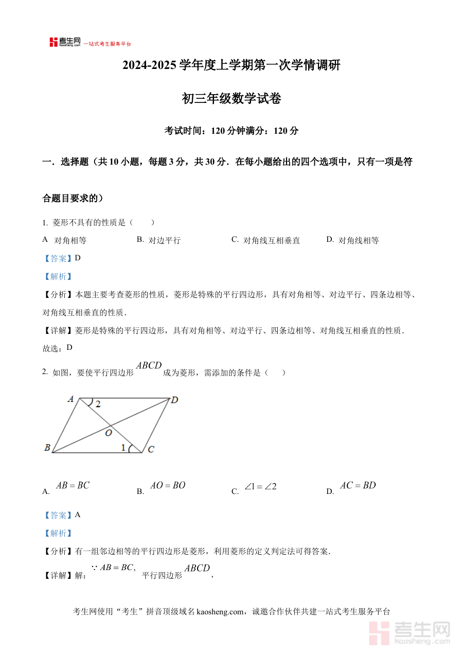 《精品解析:辽宁省沈阳市浑南区东北育才双语中学2024-2025学年九年级上学期9月月考数学试题(解析版)》是针对辽宁省沈阳市浑南区东北育才双语中学特定学年与学段的数学学科阶段性检测资料,聚焦2024-2025学年九年级上学期9月的月考场景,为该阶段的数学学习提供了具有针对性的解析类备考支持。