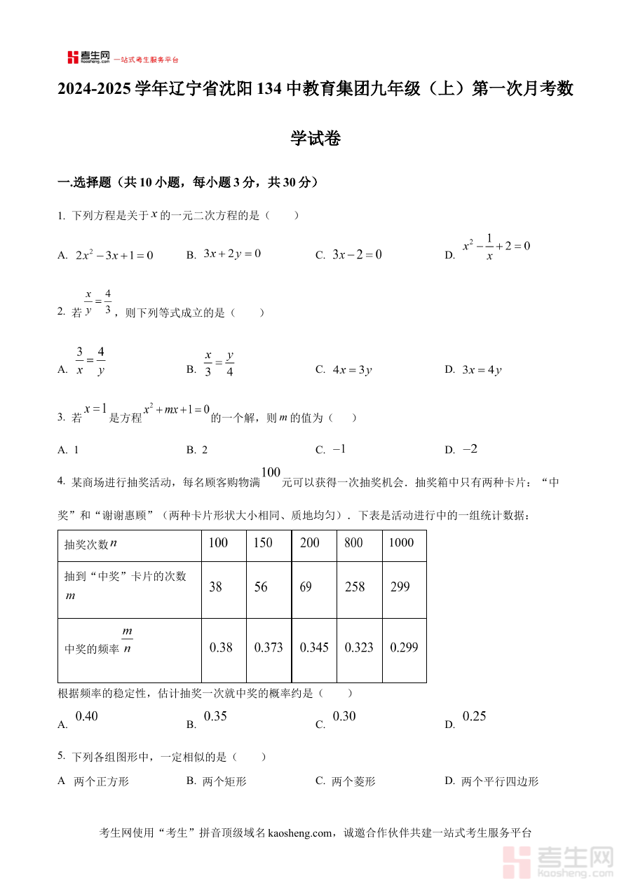 《精品解析:辽宁省沈阳市第一三四中学教育集团2024—2025学年上学期第一次月考九年级数学试卷(原卷版)》是针对辽宁省沈阳市第一三四中学教育集团2024至2025学年上学期九年级首次月考设计的数学学科原卷类备考资料。该资料依托集团统一组织的阶段检测需求,精准对应九年级上学期初期的数学学习进度与考查重点,为相关使用者提供贴合实际考试场景的备考支持。