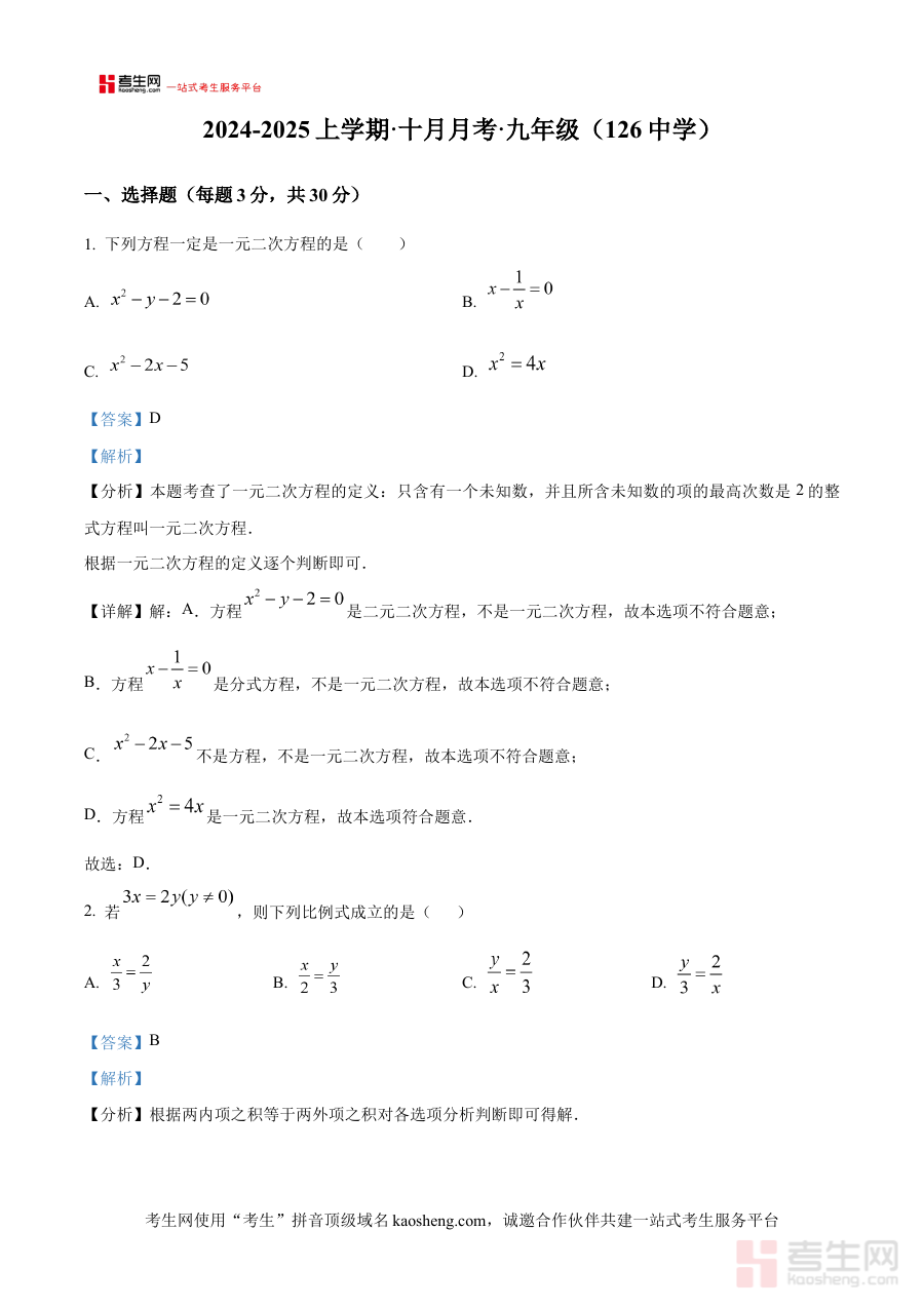 《精品解析:辽宁省沈阳市第一二六中学2024-2025学年上学期九年级10月月考试题(解析版)》是针对辽宁省沈阳市第一二六中学2024-2025学年上学期九年级10月月考这一阶段性考试的配套备考资料,贴合该地区该学段的阶段性学习检测需求,为使用者提供针对性的解析支持。