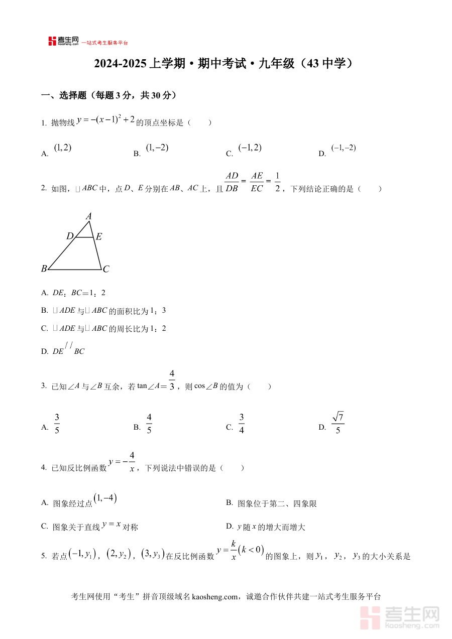 《精品解析:辽宁省沈阳市第四十三中学2024-2025学年上学期 九年级期中考试数学试题(原卷版)》是针对辽宁省沈阳市第四十三中学2024至2025学年上学期九年级数学期中考试的原卷类备考资料,贴合该学校该阶段的教学进度与考试要求,为学生提供与实际考试形式一致的试题呈现。