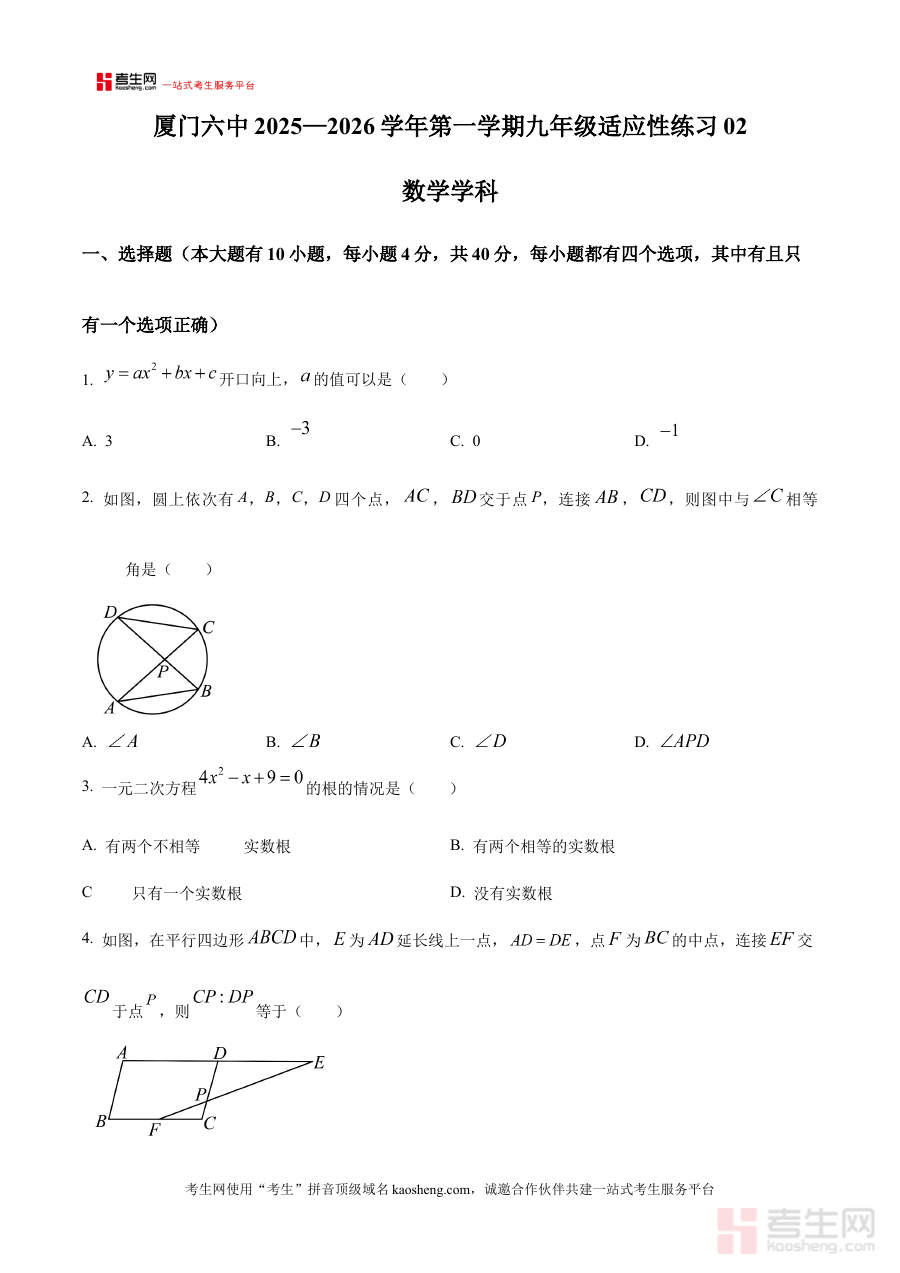 《精品解析:福建省厦门第六中学2025-2026学年上学期九年级12月月考数学试题(原卷版)》是针对福建省厦门第六中学2025-2026学年第一学期九年级学生12月份数学月考的原卷形式备考资料,精准贴合该校该阶段数学教学进度与考试标准,为师生提供与实际考试一致的练习资源。
