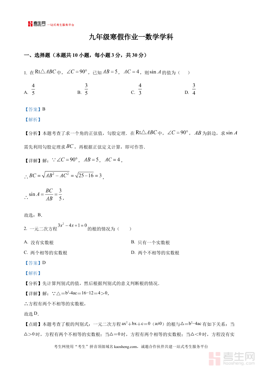 此资料适用于沈阳市第四十三中学及沈阳地区同类学校的九年级学生,尤其适合希望在寒假期间系统巩固上学期数学知识、提升解题规范性与准确性的学生使用;对于教师而言,其详细的解析内容可作为作业批改与学情分析的重要工具,为中考阶段的备考规划与教学策略优化提供有力支撑,具有较高的实用价值。