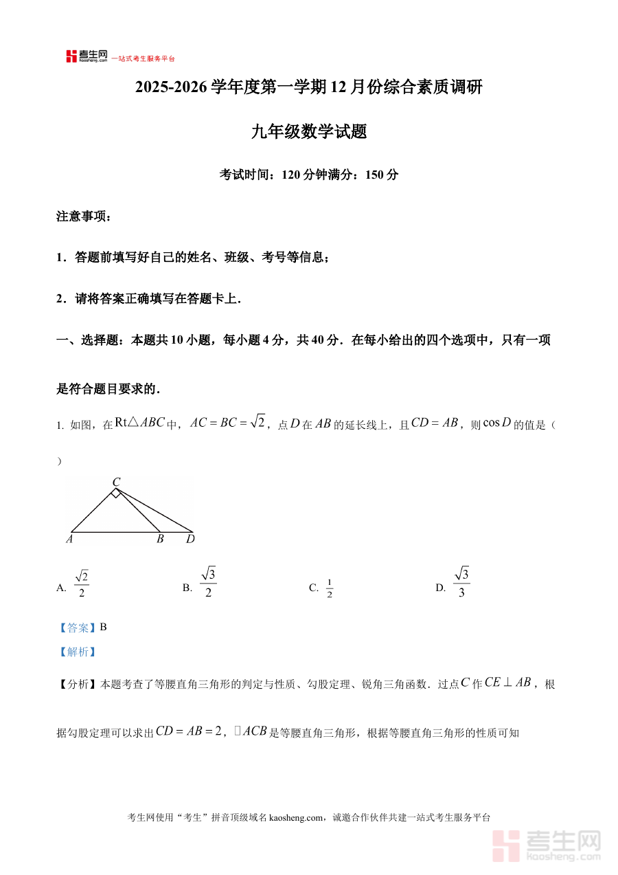 本资料适用于辽宁省沈阳市2025-2026学年上学期的九年级学生、数学教师及关注学生数学学习的家长群体。作为阶段检测的配套资源,它能帮助学生及时发现学习中的薄弱环节并调整学习方向,为教师提供评估教学效果、优化教学方案的参考素材,也能让家长更清晰地掌握孩子的学习状况,配合学校开展针对性辅导工作,共同推动学生数学能力的提升。