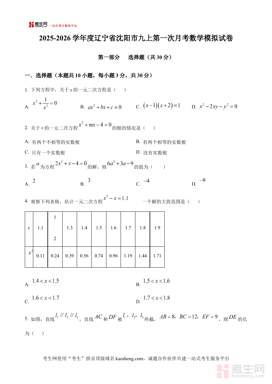 本资料适用于辽宁省沈阳市2025-2026学年的九年级学生,尤其适合需要进行第一次月考考前练习的学生群体,通过原卷版的模拟练习,能够让学生提前熟悉月考的考试形式与节奏,提升阶段检测的适应性,对后续的数学学习与备考规划具有重要参考价值。