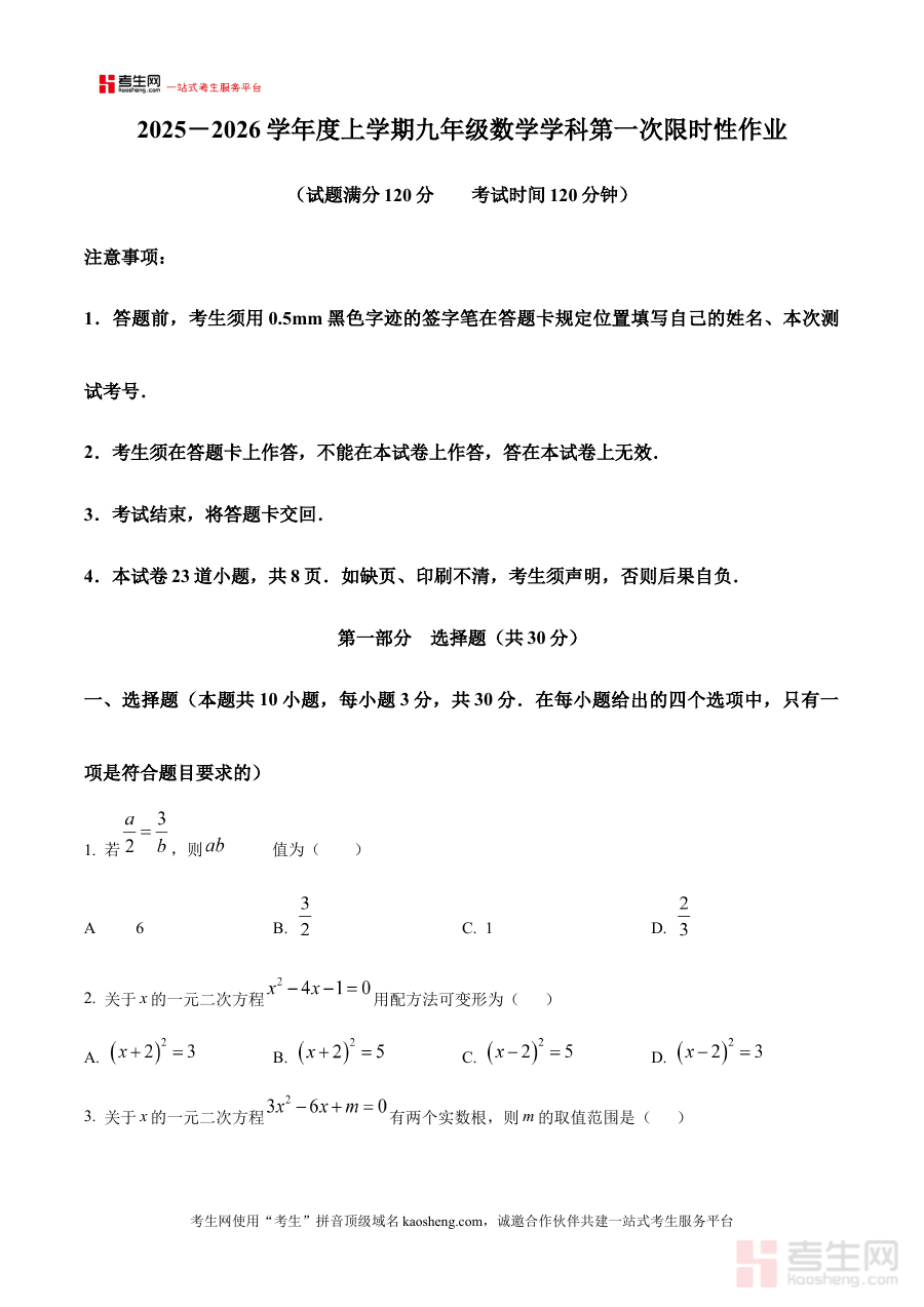 《精品解析:辽宁省沈阳市南昌中学2025-2026学年九年级上学期10月月考数学试题(原卷版)》是针对辽宁省沈阳市南昌中学2025-2026学年九年级上学期10月数学月考的专用备考资料,精准对应特定学年、学期及月份的区域校考需求,为相关师生提供贴合校考实际的参考载体。