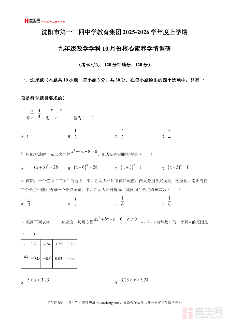 《精品解析:辽宁省沈阳市第一三四中学教育集团2025-2026学年九年级上学期10月月考数学试题(原卷版)》是针对辽宁省沈阳市第一三四中学教育集团2025-2026学年九年级学生上学期10月数学月考的备考资料,精准匹配该阶段的考试时间与区域教学需求,为使用者提供贴合本地教学实际的试题资源。