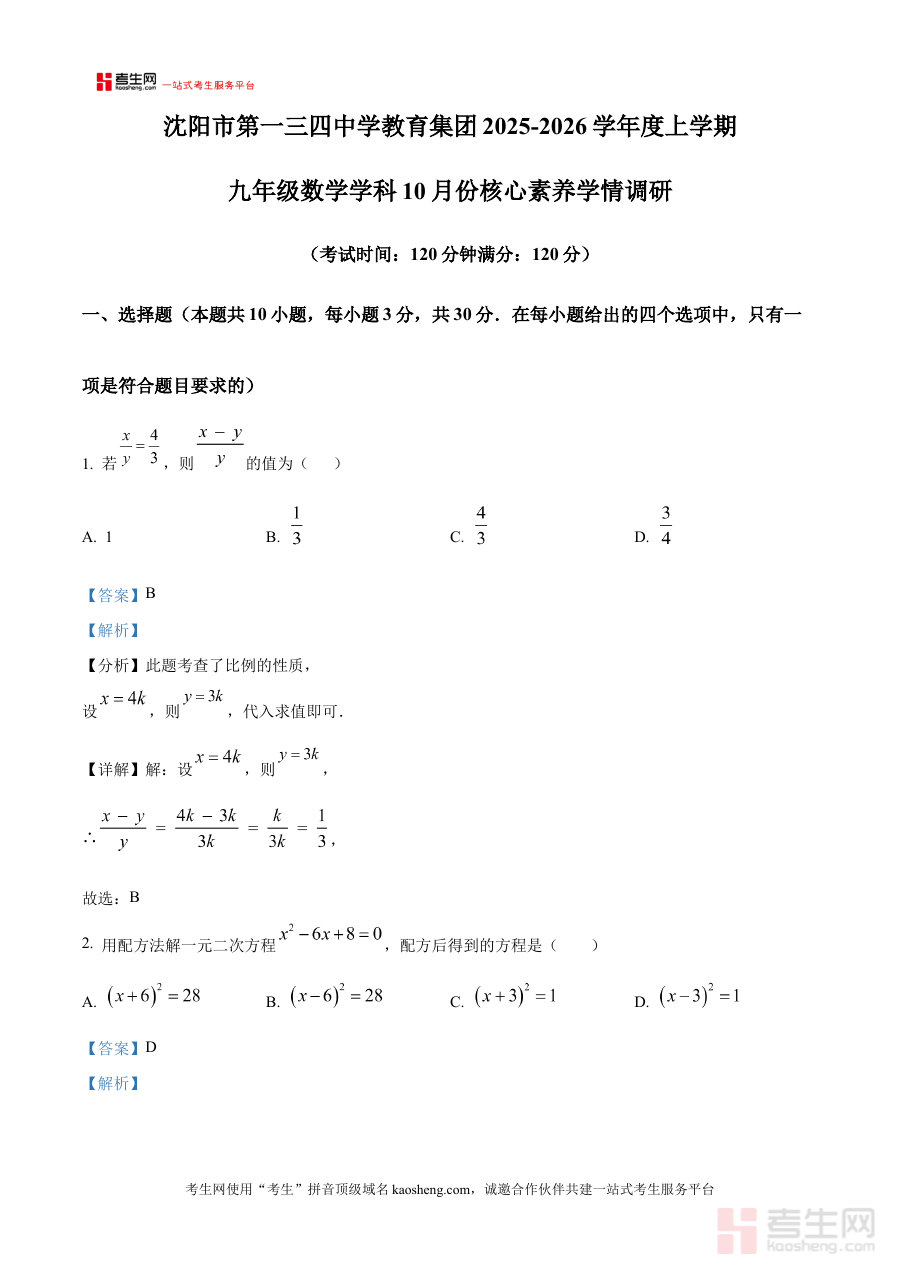 《精品解析:辽宁省沈阳市第一三四中学教育集团2025-2026学年九年级上学期10月月考数学试题(解析版)》是针对辽宁省沈阳市地区2025-2026学年九年级上学期10月月考数学科目的专业备考资料,由沈阳第一三四中学教育集团相关资源整合而成,聚焦该阶段数学学科的阶段性学习成果检验需求。