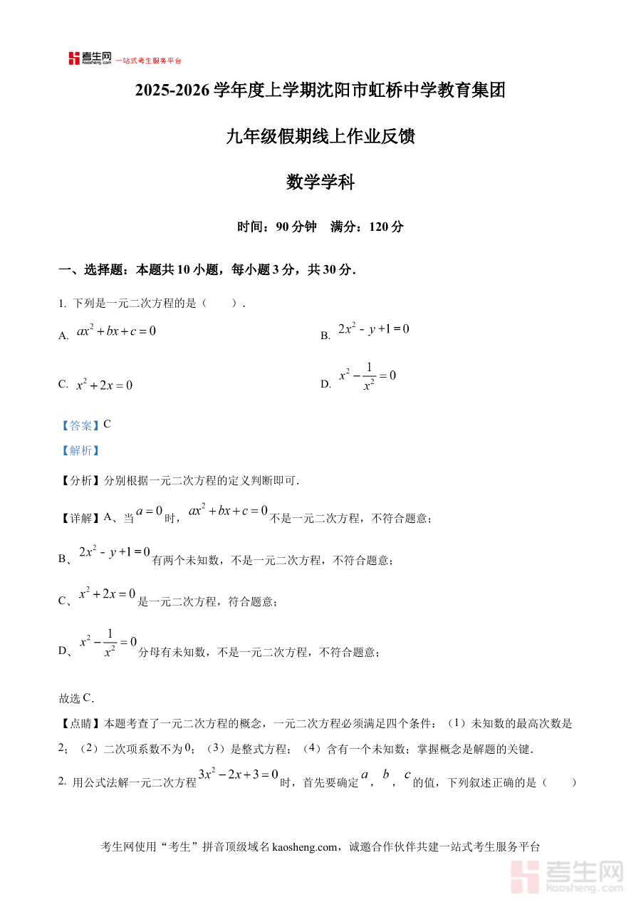 《精品解析:辽宁省沈阳市虹桥中学教育集团2025-2026学年 上学期九年级假期线上作业反馈数学试题(开学考试)(解析版)》是针对辽宁省沈阳市虹桥中学教育集团2025-2026学年上学期九年级开学考试的数学专项备考资料,紧密结合该阶段假期线上作业反馈与开学考试的衔接需求,为相关教学与学习环节提供精准支持。