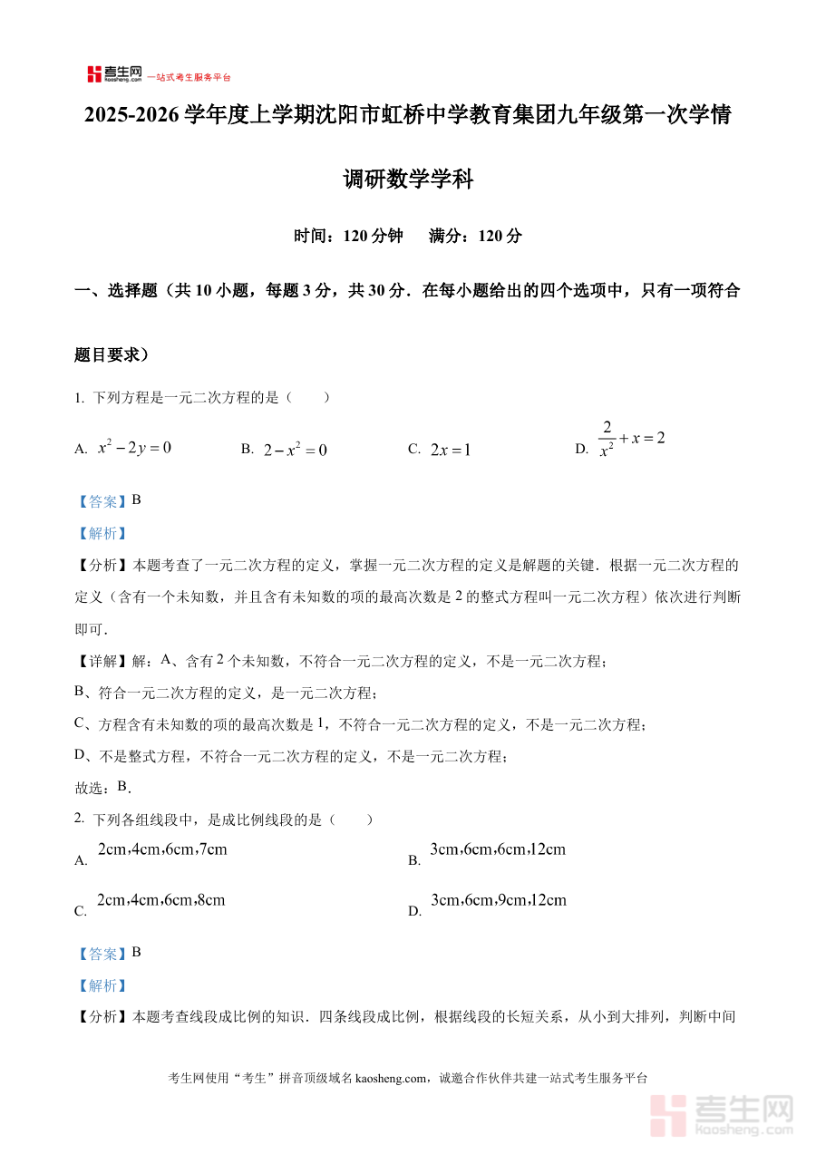 本资料适用于辽宁省沈阳市虹桥中学教育集团的九年级学生、数学教师及相关教育工作者,通过对10月月考数学试题的专业解析,能有效辅助学生巩固阶段知识、提升解题能力,也为教师优化教学策略、制定个性化辅导方案提供参考依据,具有较强的阶段检测与备考规划价值。