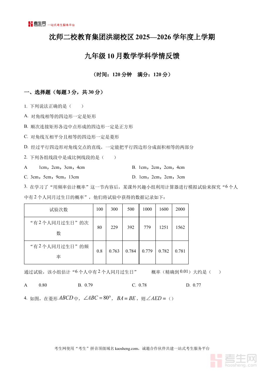 《精品解析:辽宁省沈阳师范大学第二附属学校2025-2026学年上学期10月月考九年级数学试题(原卷版)》是针对沈阳地区2025-2026学年上学期九年级数学学科的阶段性月考备考资料,聚焦该学年第一学期10月的阶段检测需求,贴合沈阳师范大学第二附属学校的教学进度与考试要求。
