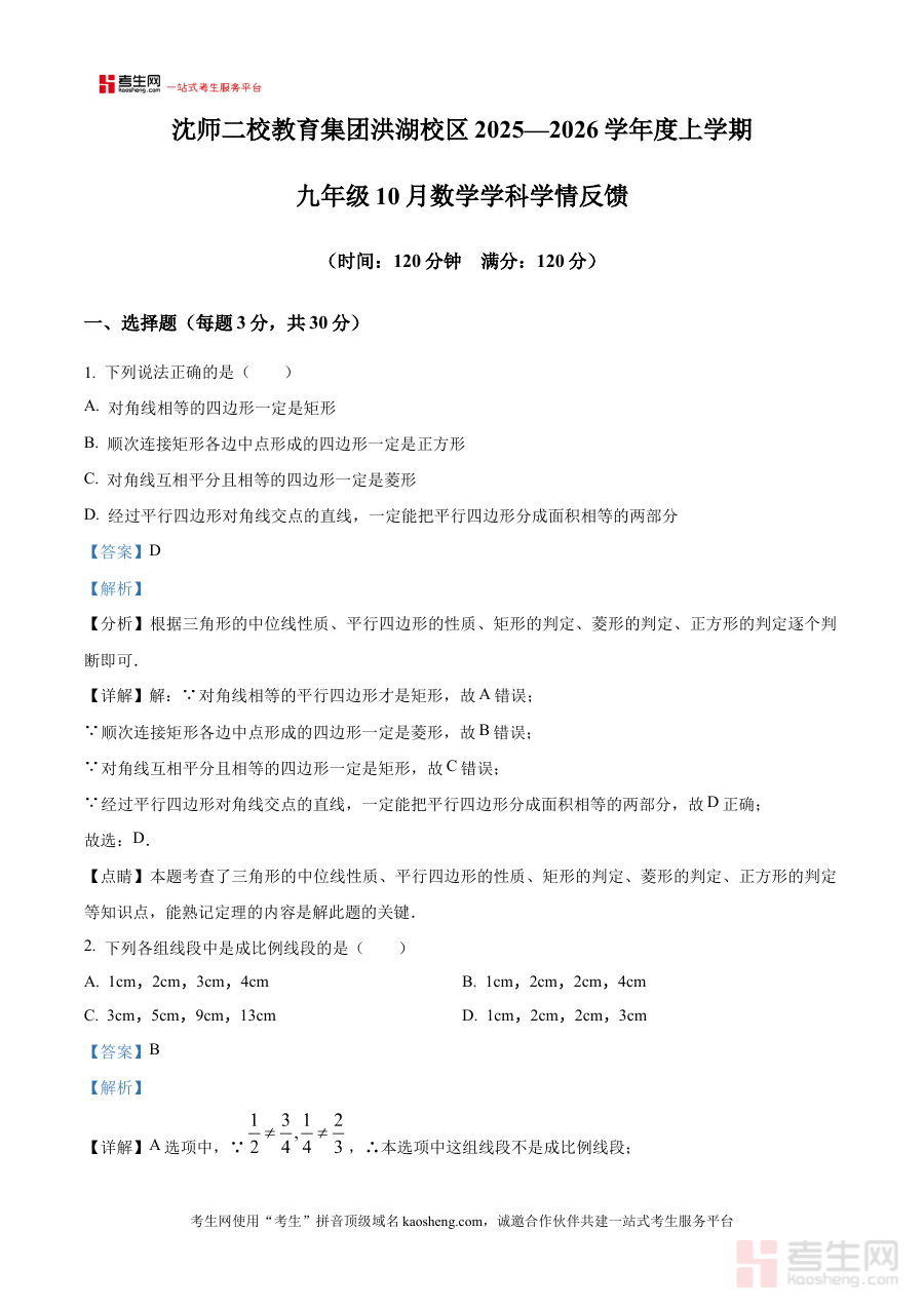 《精品解析:辽宁省沈阳师范大学第二附属学校2025-2026学年上学期10月月考九年级数学试题(解析版)》是针对辽宁省沈阳地区2025-2026学年上学期九年级数学学科10月月考的专业备考资料。该资料聚焦特定学校的阶段考试需求,为使用者提供与本次月考直接相关的解析内容支撑。