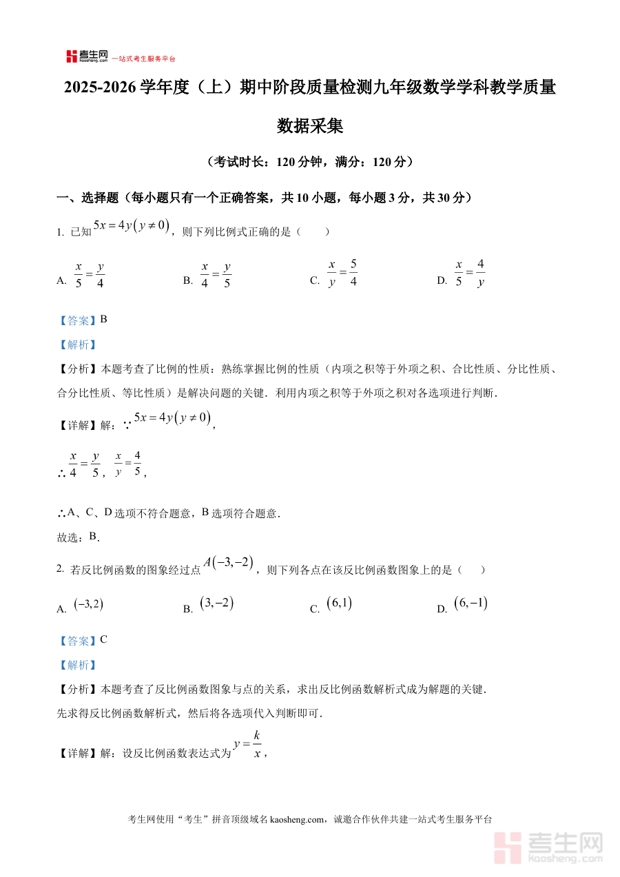 该资料通过对期中试卷的全面解析,帮助使用者把握考试的考查重点与方向,可用于学生自我检测后的学情诊断、教师教学效果的阶段性评估,以及后续备考计划的合理规划,有效提升期中复习的针对性与效率。
