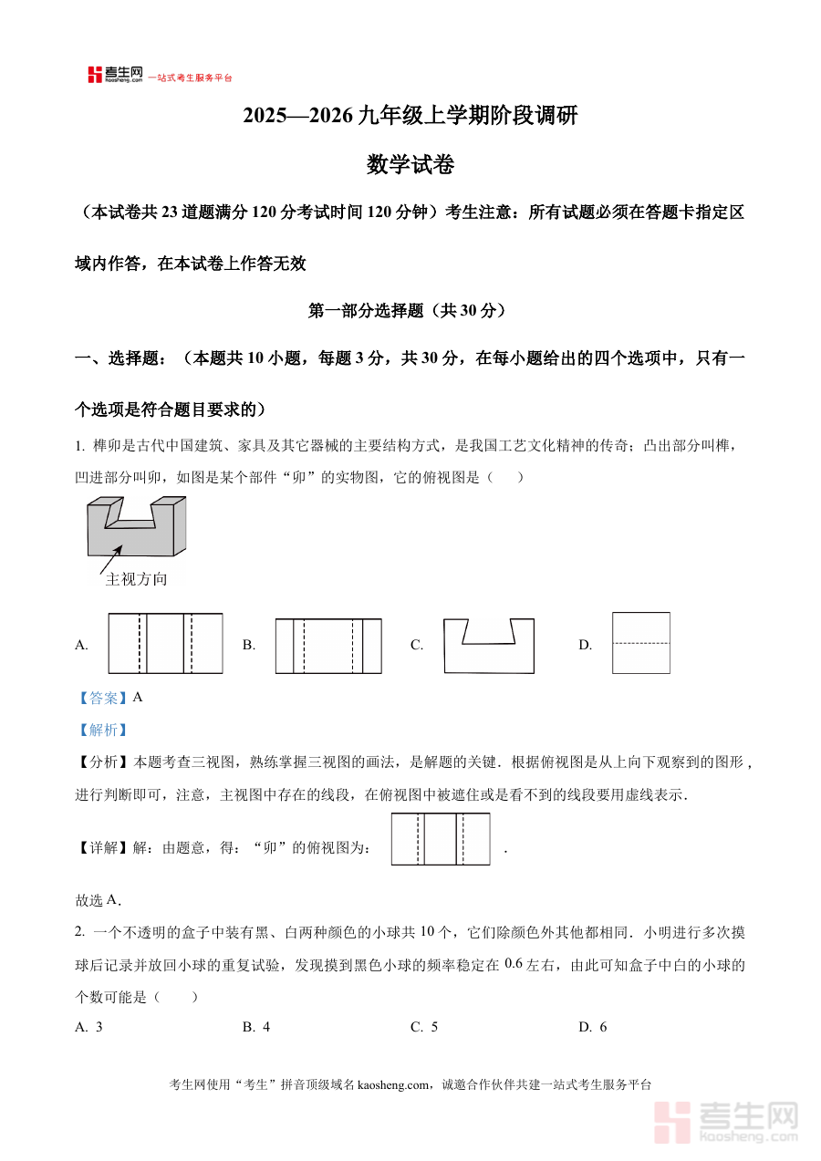 该资料适用于辽宁省沈阳市沈河区2025-2026学年的九年级学生、数学教师及学生家长。对学生而言,可助力其针对性备考本次阶段调研考试,巩固阶段知识;对教师而言,可作为教学参考与学情分析工具,优化教学安排;对家长而言,能帮助了解孩子阶段性学习状况,三方协同促进九年级上学期数学学习目标的达成,具有重要的阶段指导价值。