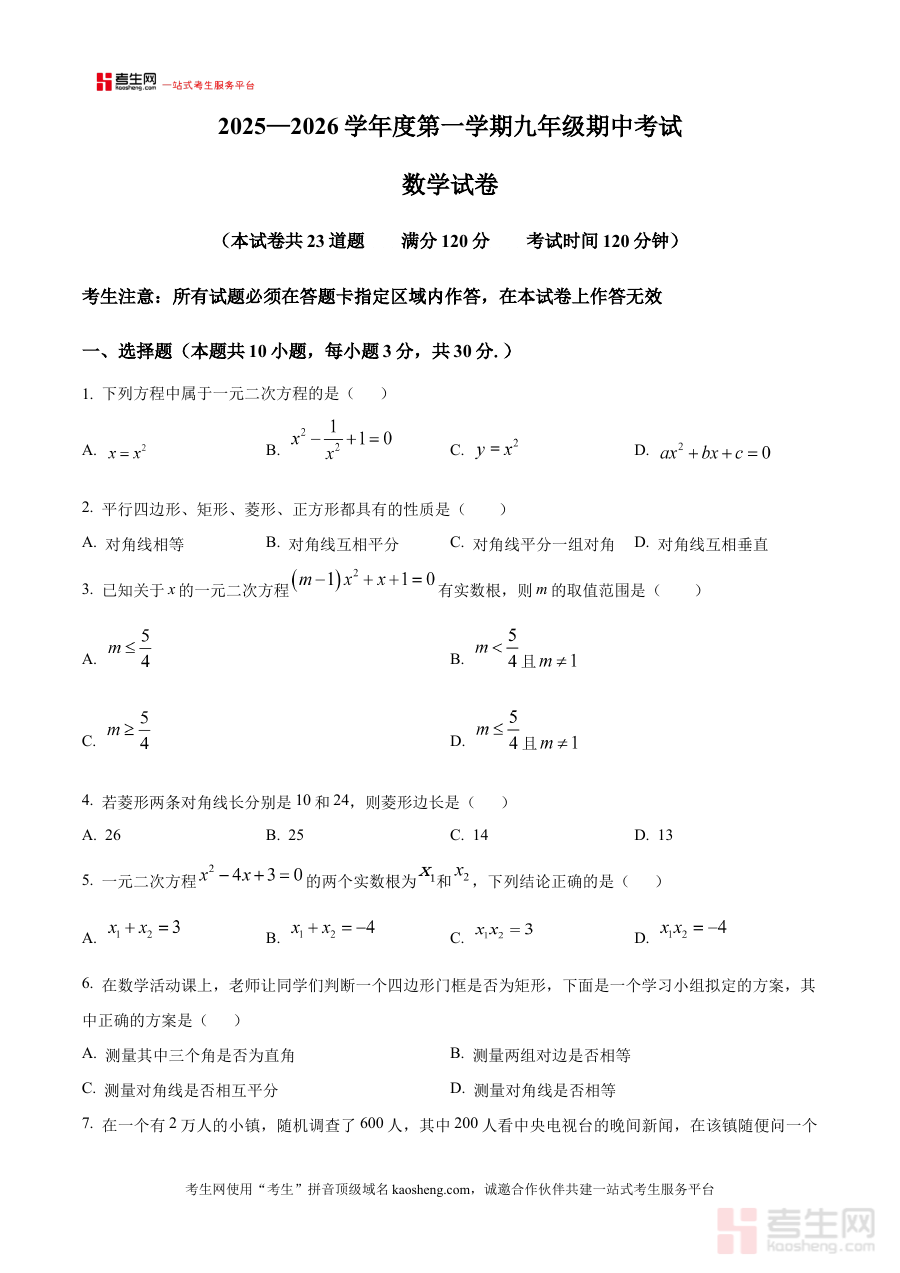 《精品解析:辽宁省沈阳市法库县2025-2026学年九年级上学期11月期中数学试题(原卷版)》是面向辽宁省沈阳市法库县2025至2026学年九年级学生的上学期11月期中数学考试原卷类备考资料。其内容严格对应本地期中阶段的数学考试设置,能够为学生提供与实际考试形式高度一致的试题载体,帮助学生提前熟悉考试流程与题型布局。