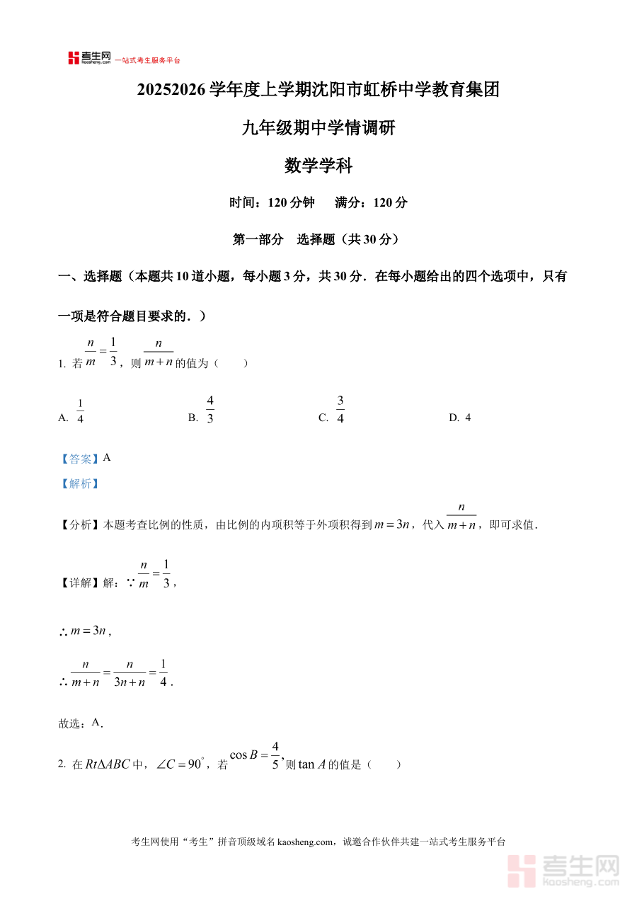 《精品解析:辽宁省沈阳市虹桥中学教育集团2025-2026学年上学期九年级期中考试数学试题(解析版)》是针对辽宁省沈阳市虹桥中学教育集团2025-2026学年上学期九年级期中考试数学科目的备考资料,聚焦该阶段数学学科的阶段性考查需求,为相关师生提供贴合本地校际联考特点的参考内容。