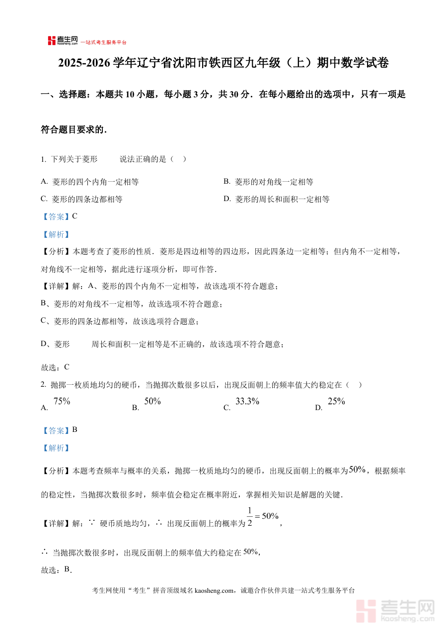 《精品解析:辽宁省沈阳市铁西区2025-2026学年九年级上学期期中考试数学试卷(解析版)》是针对辽宁省沈阳市铁西区特定学年段与考试节点的数学学科备考资料。该资料聚焦2025-2026学年九年级上学期期中考试这一关键阶段测试,精准匹配铁西区区域内的考试需求,作为解析版资料,其核心定位是为相关群体提供与本地期中测试直接关联的系统性备考支持。