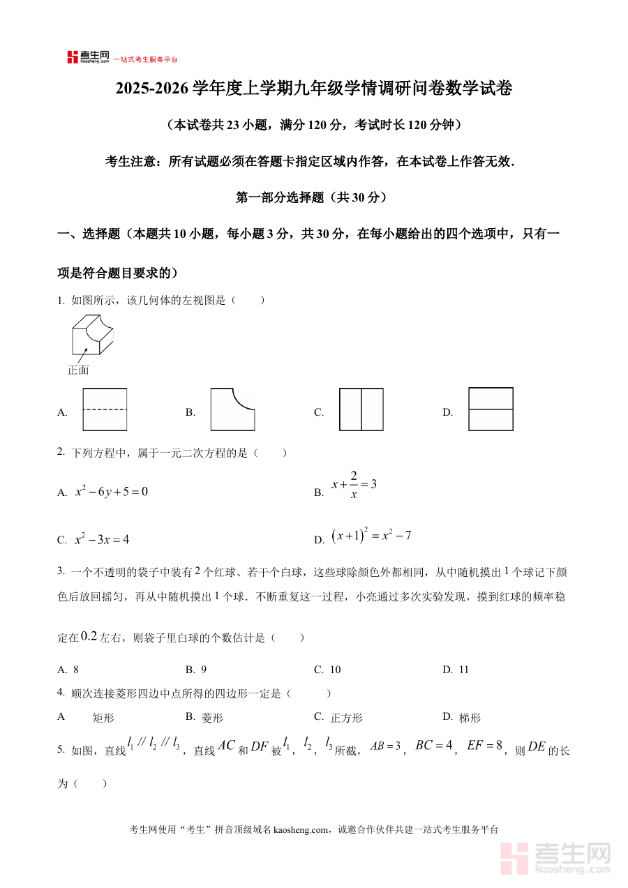 《精品解析:辽宁省沈阳市苏家屯区2025-2026学年九年级上学期期末数学试卷(原卷版)》是针对辽宁省沈阳市苏家屯区2025-2026学年九年级上学期期末数学考试的专属备考资料,精准匹配该地区该学年九年级上学期的期末数学检测场景,为相关教学与学习活动提供针对性的资源支撑。