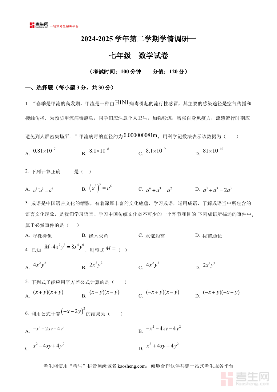 本资料的适用人群主要包括西安经开第一学校2024-2025学年七年级的学生、数学教师以及关注学生数学学习进展的家长。学生可利用它进行考前模拟训练,提升应试能力;教师可将其作为学情分析的工具,调整教学策略;家长则能通过该资料了解孩子所在学校的考试要求与学习难度,更好地配合学校开展家庭教育。其价值在于帮助使用者清晰把握七年级下学期初期数学学习的阶段性目标,为后续学习规划提供数据支持与方向指引。