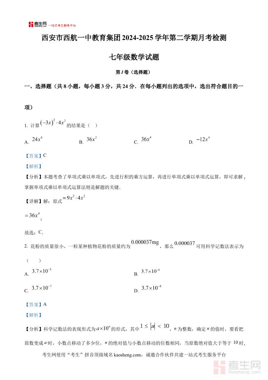 《精品解析:陕西省西安市西航一中教育集团2024-2025学年下学期3月月考七年级数学试卷(解析版)》是针对陕西省西安市西航一中教育集团所属七年级学生在2024-2025学年下学期3月开展的数学月考试卷及配套解析资料。该资料紧密结合区域教育集团的教学进度与阶段性考查目标,精准匹配七年级下学期数学学科的阶段学习重点,为学生提供与实际考试高度契合的备考资源,助力学生提前熟悉考试模式与考查方向,为阶段性学习成果检验做好充分准备。
