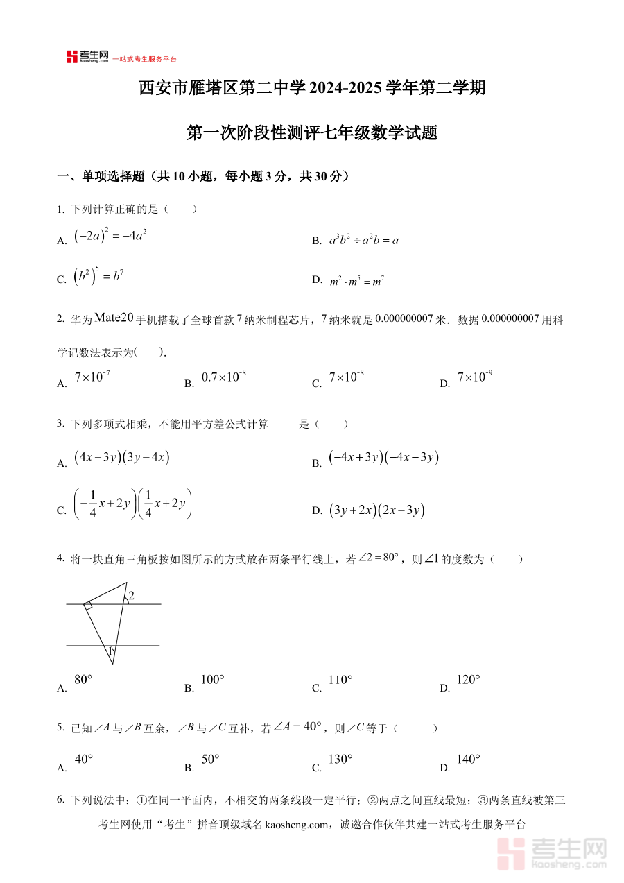 《精品解析:陕西省西安市雁塔区第二中学2024-2025学年下学期第一次月考七年级数学试题(原卷版)》是针对陕西省西安市雁塔区第二中学2024-2025学年下学期七年级数学第一次月考的原卷版备考资料。原卷版完整保留本次月考的考试结构与命题风格,为师生提供贴近实际考试场景的参考素材,帮助使用者直观了解本次月考的考查范围与形式特点,是适配该次月考场景的针对性备考资源。