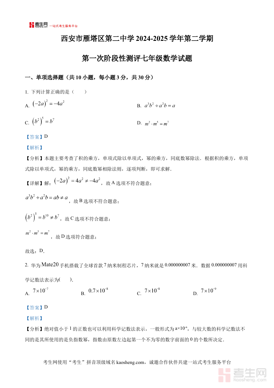 《精品解析:陕西省西安市雁塔区第二中学2024-2025学年下学期第一次月考七年级数学试题(解析版)》是针对陕西省西安市雁塔区第二中学特定学年下学期七年级数学第一次月考的专业备考资料。它精准覆盖了该学校2024-2025学年下学期七年级数学学科第一次月考的考查场景,明确了考试的时间范围、地域归属、学校主体、年级学科及考试阶段等核心元信息,依托该校实际教学进度与考试命题要求构建内容框架,为对应阶段的数学学习提供高度贴合的参考依据,帮助使用者快速把握该次月考的考查方向、核心要点及命题思路。