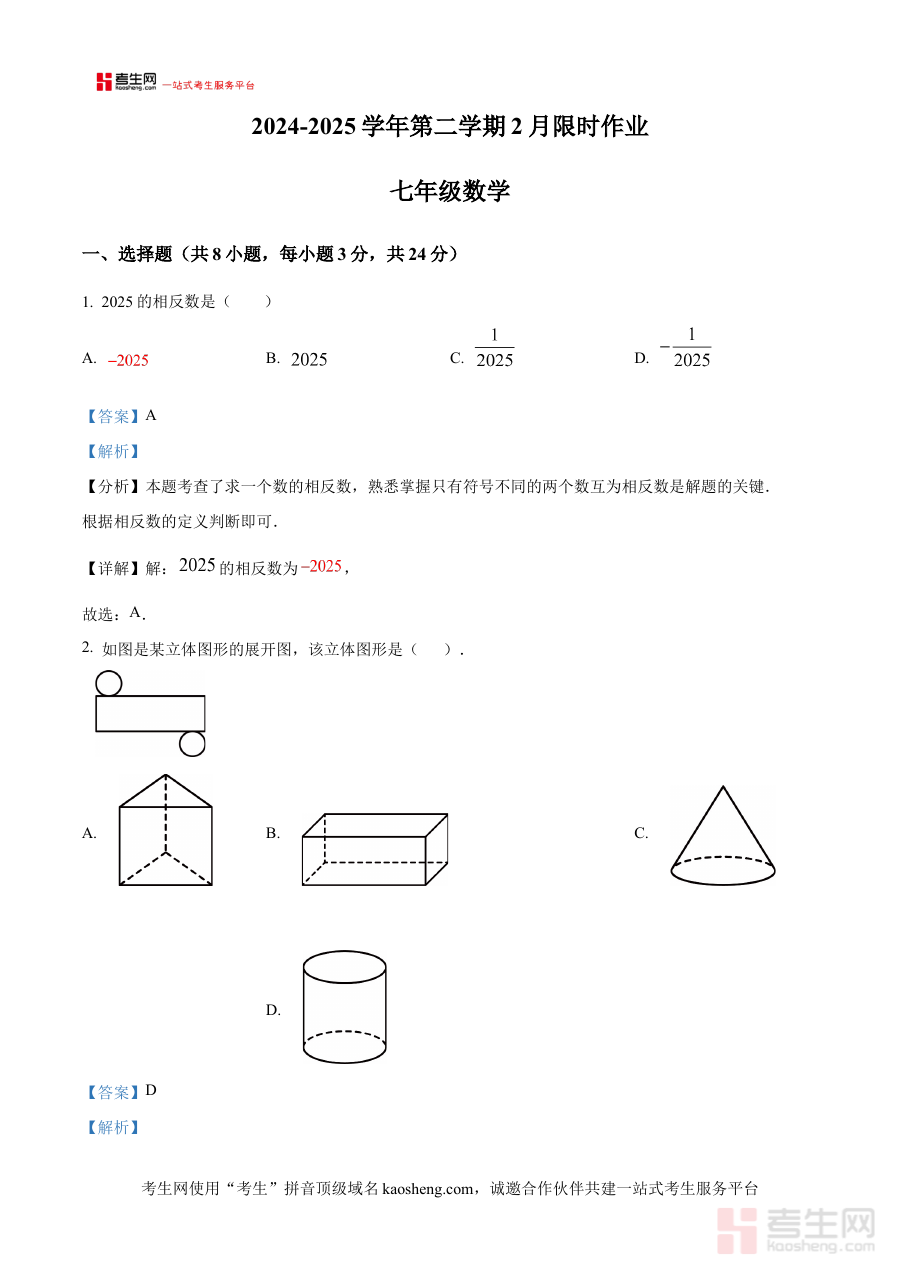 《精品解析:陕西省西安市高新区第三中学2024-2025学年七年级下学期开学考试数学试题(解析版)》是针对陕西省西安市高新区第三中学2024-2025学年七年级下学期开学数学考试的专项备考资料,聚焦该阶段学生数学学习的衔接需求,结合开学考试的性质提供针对性解析内容,旨在帮助相关群体高效应对该次考试的备考需求,依托试题及解析提供清晰的学习指引。