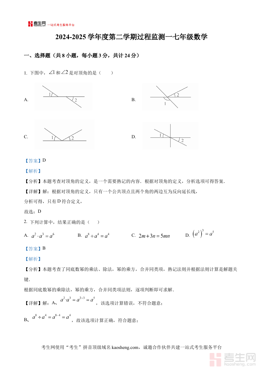 《精品解析:陕西省西安市高新区第十初级中学2024-2025学年七年级下学期第一次月考数学试题(解析版)》是针对陕西省西安市高新区第十初级中学特定学年及学段的数学月考备考资料,其年份定位为2024-2025学年,地域聚焦于西安市高新区第十初级中学,考试类型为七年级下学期第一次数学月考,具备明确的针对性和地域适配性,能够精准对接该学校该阶段学生的数学学习进度与月考考查需求。