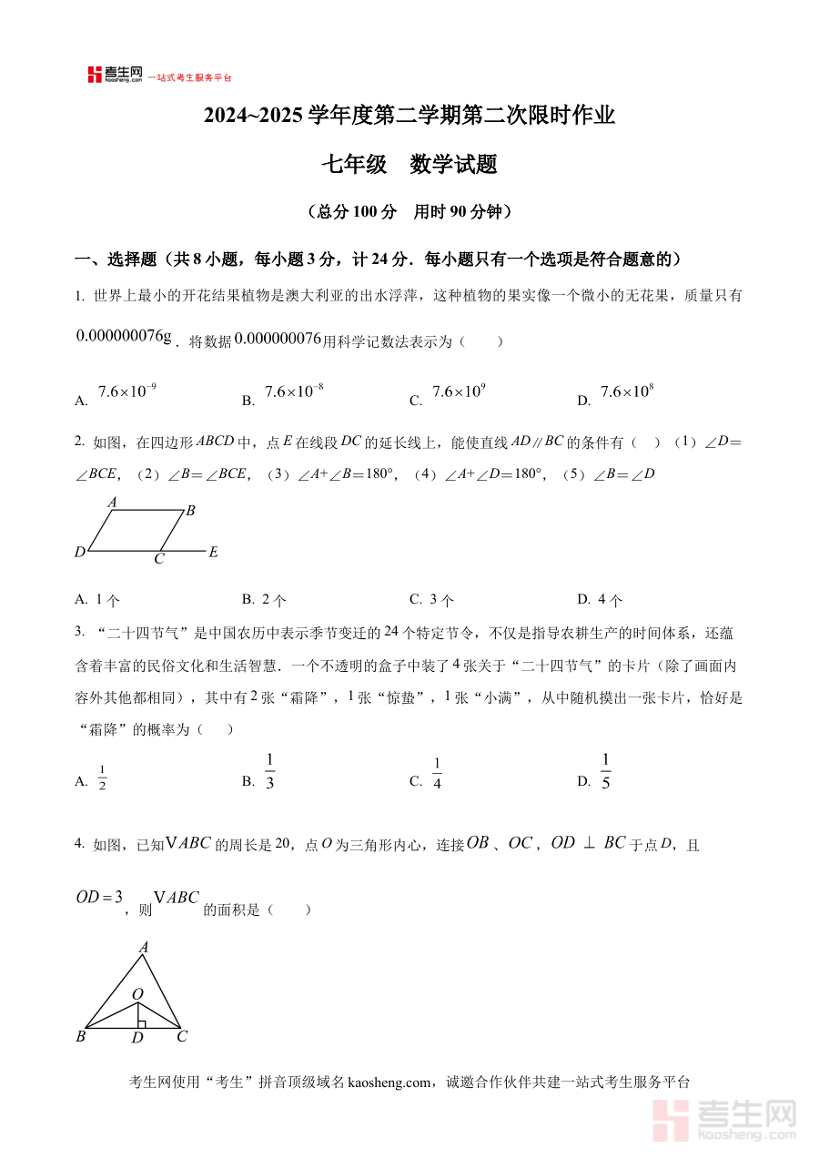 《精品解析:陕西省西安市高新第三中学2024-2025学年七年级下学期第二次月考数学试题(原卷版)》是针对陕西省西安市高新第三中学2024-2025学年七年级下学期第二次月考数学科目的专用备考资料,精准匹配该校该阶段数学教学进度与考试要求。作为原始试卷版本,它完整还原了此次月考数学试题的呈现形式,为使用者提供与真实考试场景高度一致的练习载体,帮助使用者提前熟悉考试结构与节奏,是开展针对性复习与备考的核心资源之一。