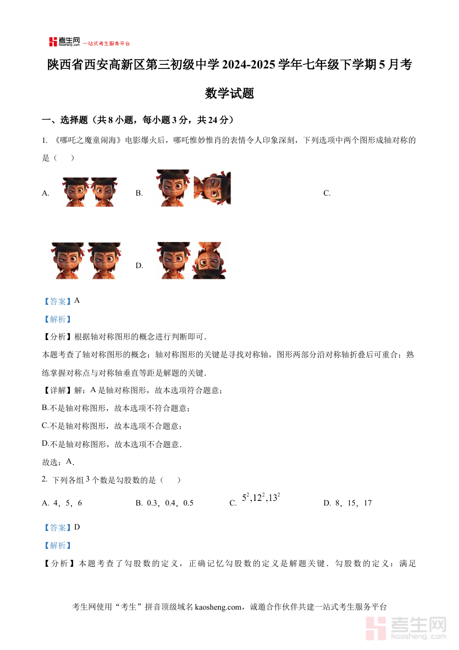 《精品解析:陕西省西安高新区第三初级中学2024-2025学年 七年级下学期5月考数学试题(解析版)》是针对2024-2025学年陕西省西安高新区第三初级中学七年级下学期5月数学月考编制的专业备考资料,它依托该学校该阶段的数学教学进度与考试要求,为学习者提供了与实际考试紧密结合的解析内容,能够帮助使用者快速把握该次月考的核心方向与考查重点,是适配该阶段数学学习需求的针对性资源。