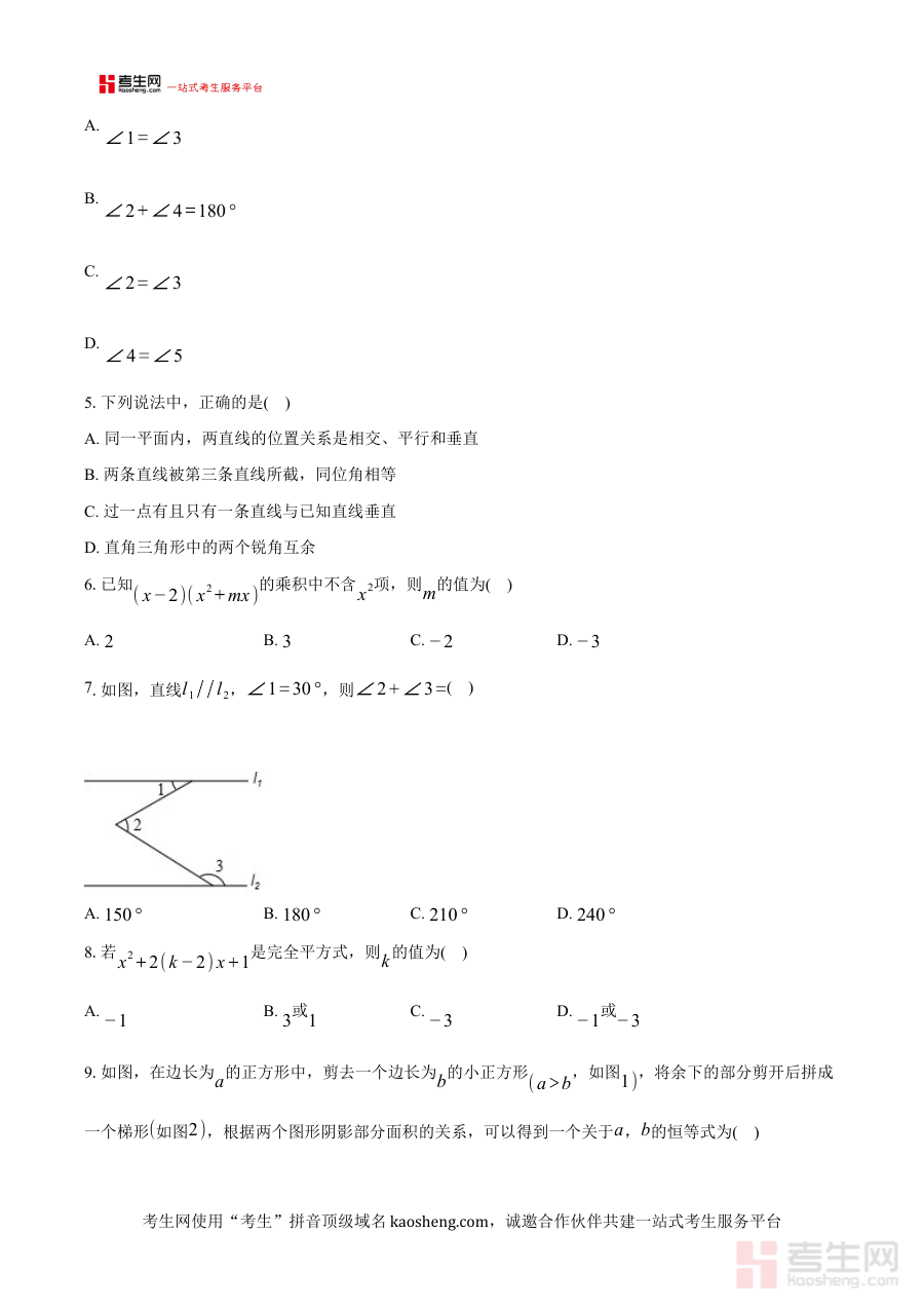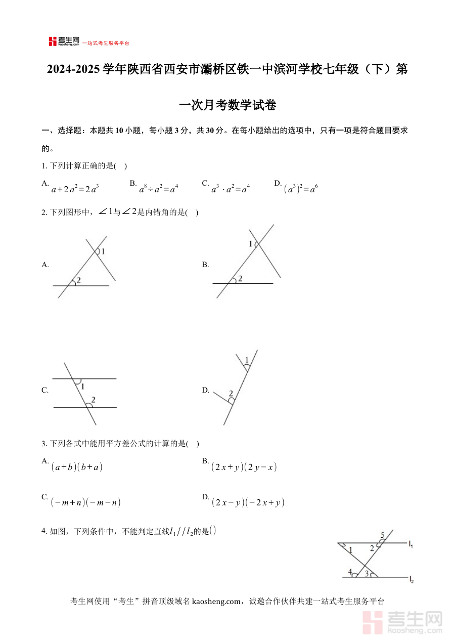《陕西省西安市灞桥区铁一中滨河学校2024-2025学年七年级下学期第一次月考数学试卷》是陕西省西安市灞桥区铁一中滨河学校在2024-2025学年七年级下学期初期开展的数学阶段性检测资料,紧密贴合该校七年级下学期数学教学的初始阶段目标与内容方向,能够直观反映该校对七年级学生新学期数学知识掌握情况的检测重点与评价标准,为相关使用者提供了符合该校教学实际的阶段性数学检测参考依据。作为新学期首次数学月考,该试卷旨在衔接上学期数学知识与新学期初期学习内容,是该校七年级数学教学评价体系中关键的阶段性组成部分。