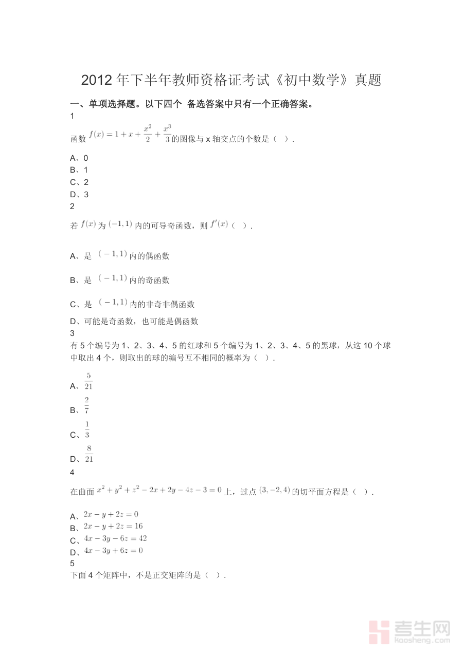 《2012年下半年教师资格证考试《初中数学》真题》是2012年下半年面向初中数学学科教师资格申请者的官方考试真题资料。该资料对应全国教师资格证考试体系中的初中数学科目,能够直观呈现当时该类考试的命题框架与评价导向,为备考者提供贴近真实考试情境的参考依据,是初中数学教师资格证考试备考过程中具有基础性价值的资料类型。