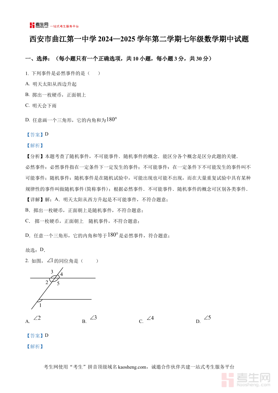 《精品解析:陕西省西安市曲江一中2024-2025学年下学期七年级期中数学试卷(解析版)》是针对2024-2025学年下学期陕西省西安市曲江第一中学七年级期中数学考试设计的专业备考资料。该资料紧扣特定学年学期的教学进度与学校期中考查标准,聚焦七年级数学学科的阶段性学习内容,为使用者提供与实际考试场景高度契合的解析支持,助力快速对接考试目标与考查方向。