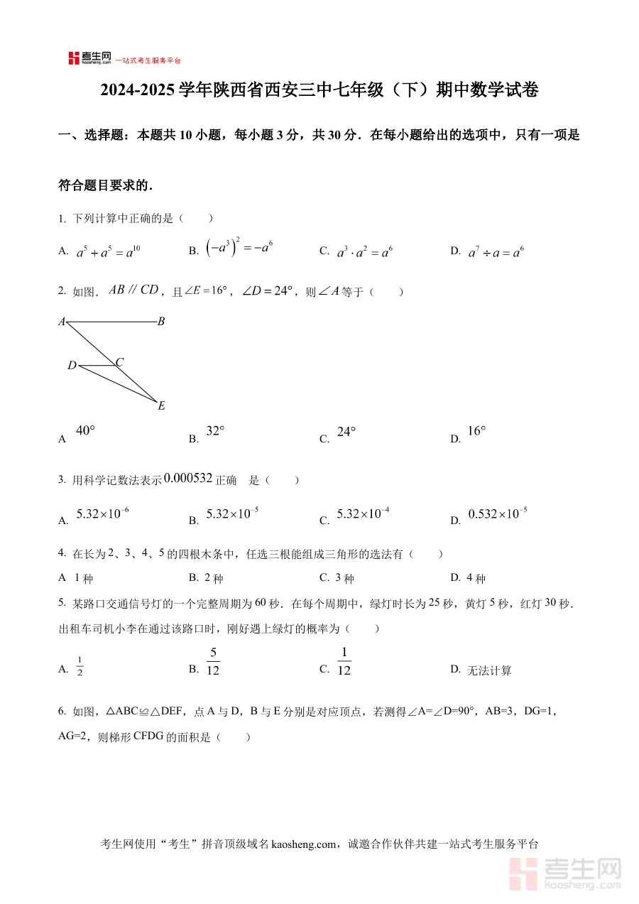 《精品解析:陕西省西安市第三中学2024—2025学年下学期七年级期中数学试卷-(原卷版)》是针对2024—2025学年下学期陕西省西安市第三中学七年级期中数学考试推出的官方原卷形式备考资料,它完整呈现了该次期中数学考试的试卷原貌,能够帮助使用者直观了解考试的整体框架、题量分布与命题风格方向,为后续的复习与备考提供真实可靠的参考依据。