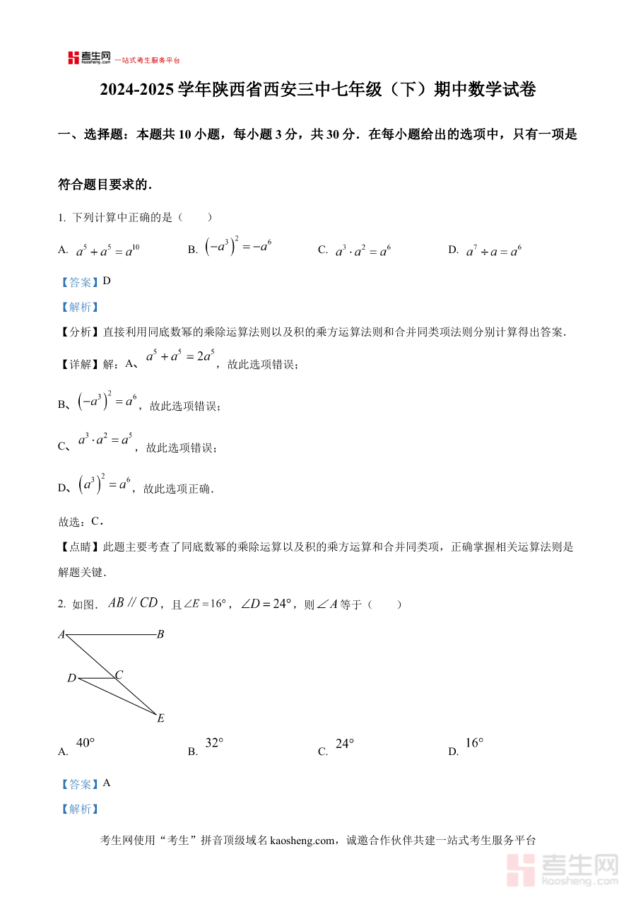 《精品解析:陕西省西安市第三中学2024—2025学年下学期七年级期中数学试卷-(解析版)》是针对陕西省西安市第三中学特定学年学期的七年级期中数学考试所编制的专业备考资料。该资料依托该校2024至2025学年下学期七年级数学学科的教学进度与期中考查范围,以解析版形式呈现,旨在为相关使用者提供贴合考试实际的参考依据。作为聚焦特定学校、特定学段与特定考试节点的针对性资料,它能够帮助使用者精准把握该次期中数学考试的考查方向与具体要求,为后续的备考活动提供清晰且有效的指引。