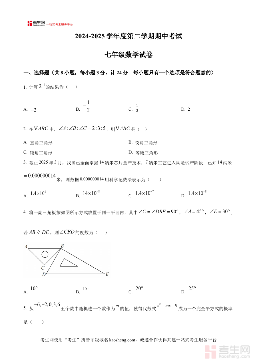 《精品解析:陕西省西安市铁一中学2024-2025学年下学期七年级数学期中考试试卷(原卷版)》是陕西省西安市铁一中学针对2024-2025学年下学期七年级学生数学期中考试推出的备考资料。该资料严格遵循学校该学期数学教学进度与期中检测要求,完整呈现了期中考试试卷的原始形态,为使用者提供了贴近该校实际考试场景的参考依据,有助于相关人员清晰把握该阶段数学考试的整体结构与考查方向。