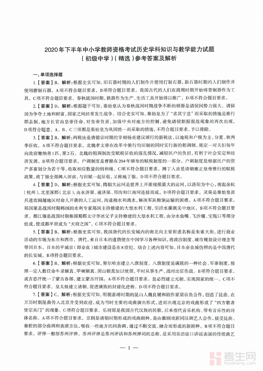 《2020年下半年教师资格证考试《初中历史》题 (解析)精选》是针对2020年下半年全国教师资格证考试初中历史学科的专业备考资料,依托该次考试的命题背景与学科要求整合相关试题及对应解析内容。作为教师资格证考试备考体系中的重要资源,它聚焦初中历史学科的考试目标与命题规律,为考生提供贴近实际考试场景的参考素材,助力考生把握考试核心方向与考查重点。