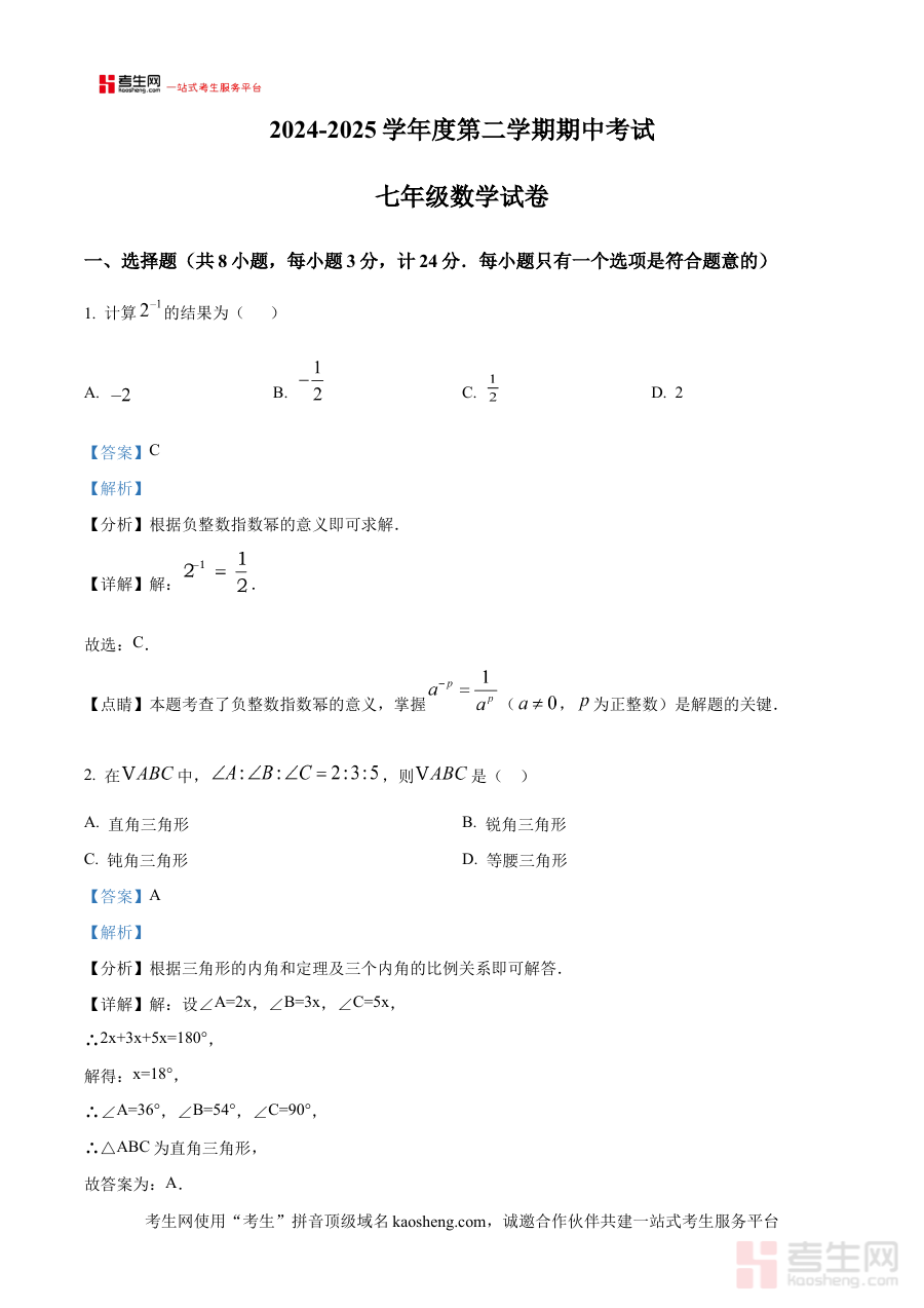 《精品解析:陕西省西安市铁一中学2024-2025学年下学期七年级数学期中考试试卷(解析版)》是针对陕西省西安市铁一中学2024至2025学年下学期七年级学生数学期中考试设计的专业备考资料。该资料紧密结合该校七年级下学期数学教学进度与期中考试的考查目标,以解析版形式呈现试卷相关内容,为学生提供贴合本校考试要求的复习资源,帮助学生提前把握期中考试的考查方向与核心需求,为有效备考搭建清晰的路径,助力学生在阶段学习中巩固已学知识、提升知识应用能力。