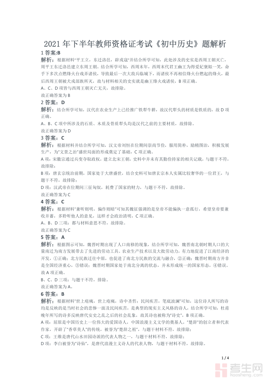 《2021年下半年教师资格证考试《初中历史》题 (解析)》是针对2021年下半年全国教师资格证考试初中历史学科的专业备考资料,包含该次考试的真题及配套解析内容,为备考者提供了与实际考试直接相关的学习参考依据,有助于备考者快速熟悉考试的整体框架与核心考查方向。
