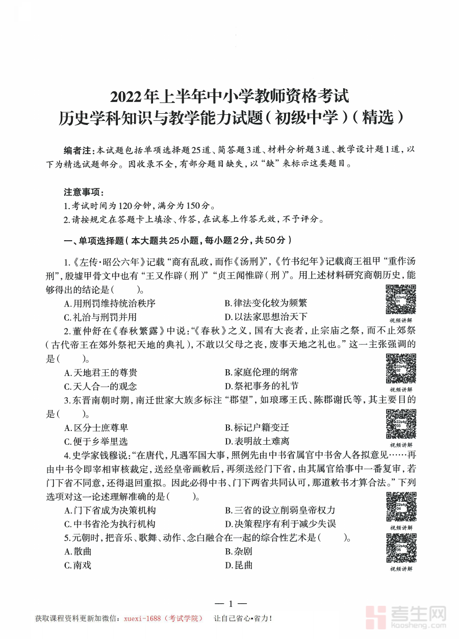 《2022年上半年教师资格证考试《初中历史》题(精选)》是针对2022年上半年教师资格证考试初中历史学科的精选试题类备考资料,它聚焦该次考试初中历史科目的核心考查方向,整合了具有代表性的试题内容,为考生提供贴合考试实际的练习载体,助力考生熟悉考试情境与考查形式。