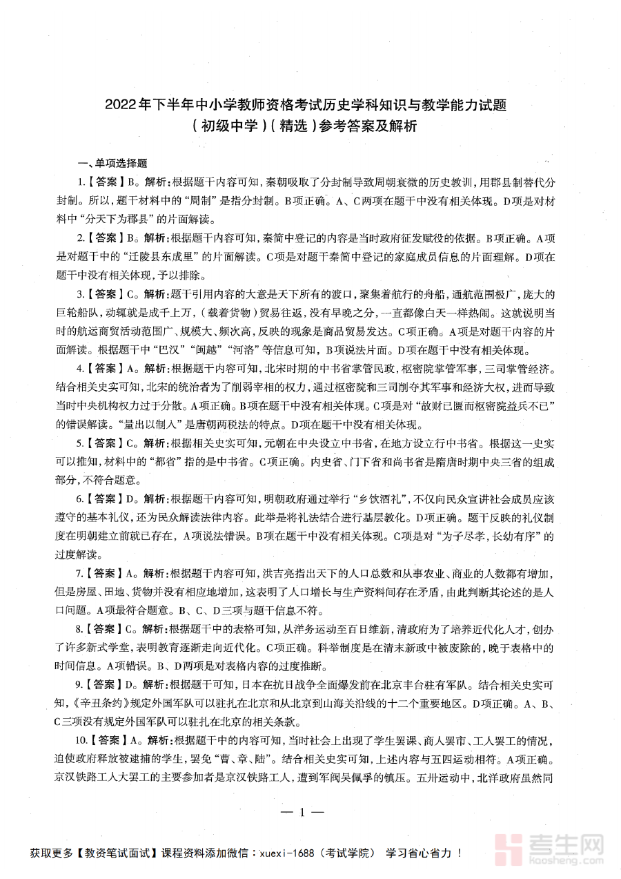 《2022年下半年教师资格证考试《初中历史》题解(精选)(OCR)》是针对2022年下半年全国教师资格证考试初中历史学科的专业化备考资料。该资料依托当次考试的命题导向与学科特点,通过精选题解的形式呈现核心内容,同时标注OCR标识表明其经过规范的文字识别处理,可满足考生对资料数字化查阅与使用的需求,旨在为考生提供具有参考价值的解题指导与知识梳理方向。