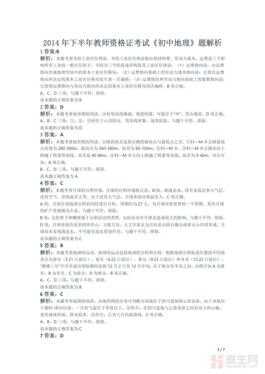 《2014年下半年教师资格证考试《初中地理》题 (解析)》是针对2014年下半年举办的初中地理学科教师资格证考试推出的备考资料,其内容紧密围绕该次考试的学科要求展开,为备考者提供了与当年考试直接相关的题目及对应的解析内容,是了解该次考试命题特点和考查方向的重要参考材料。