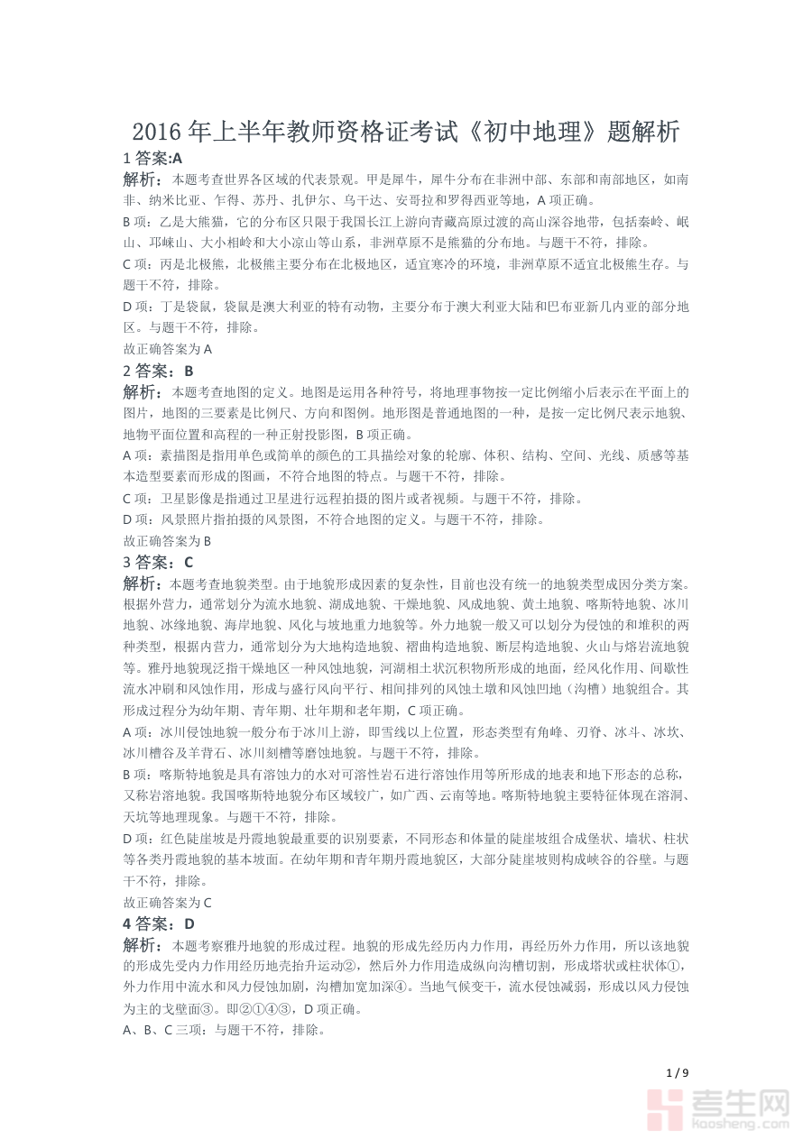 《2016年上半年教师资格证考试《初中地理》题(解析)》是2016年上半年面向初中地理学科教师资格证考试的专业备考资料。该资料对应特定年份和学科的教师资格认证考试需求,聚焦初中地理领域的考试内容属性,作为试题解析类资料具有明确的时间与学科指向性,为考生提供了该次考试的直接参考依据,是衔接考试内容与备考实践的重要载体。