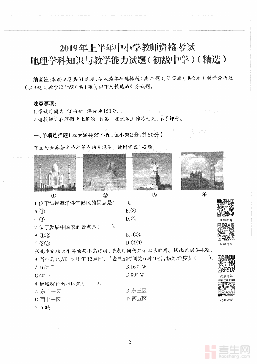 《2019年上半年教师资格证考试《初中地理》题》是2019年上半年针对初中地理学科教师资格证考试的专用备考资料,聚焦该时间段内初中地理教资考试的核心命题方向,为备考者提供了与考试直接相关的题目类资源,是了解该次考试内容框架及考查重点的重要参考载体,有助于备考者建立对初中地理教资考试体系的初步认知与整体把握。