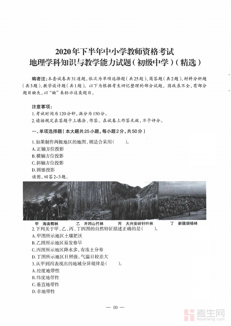 《2020年下半年教师资格证考试《初中地理》题(精选)》是针对2020年下半年举行的初中地理学科教师资格证考试打造的备考资料。该资料紧密贴合此次考试的时间节点与学科要求,通过精选的题目资源为考生提供与考试直接相关的复习素材,帮助考生建立对考试内容的初步认知和整体把握,是备考过程中具有明确针对性的参考资源。